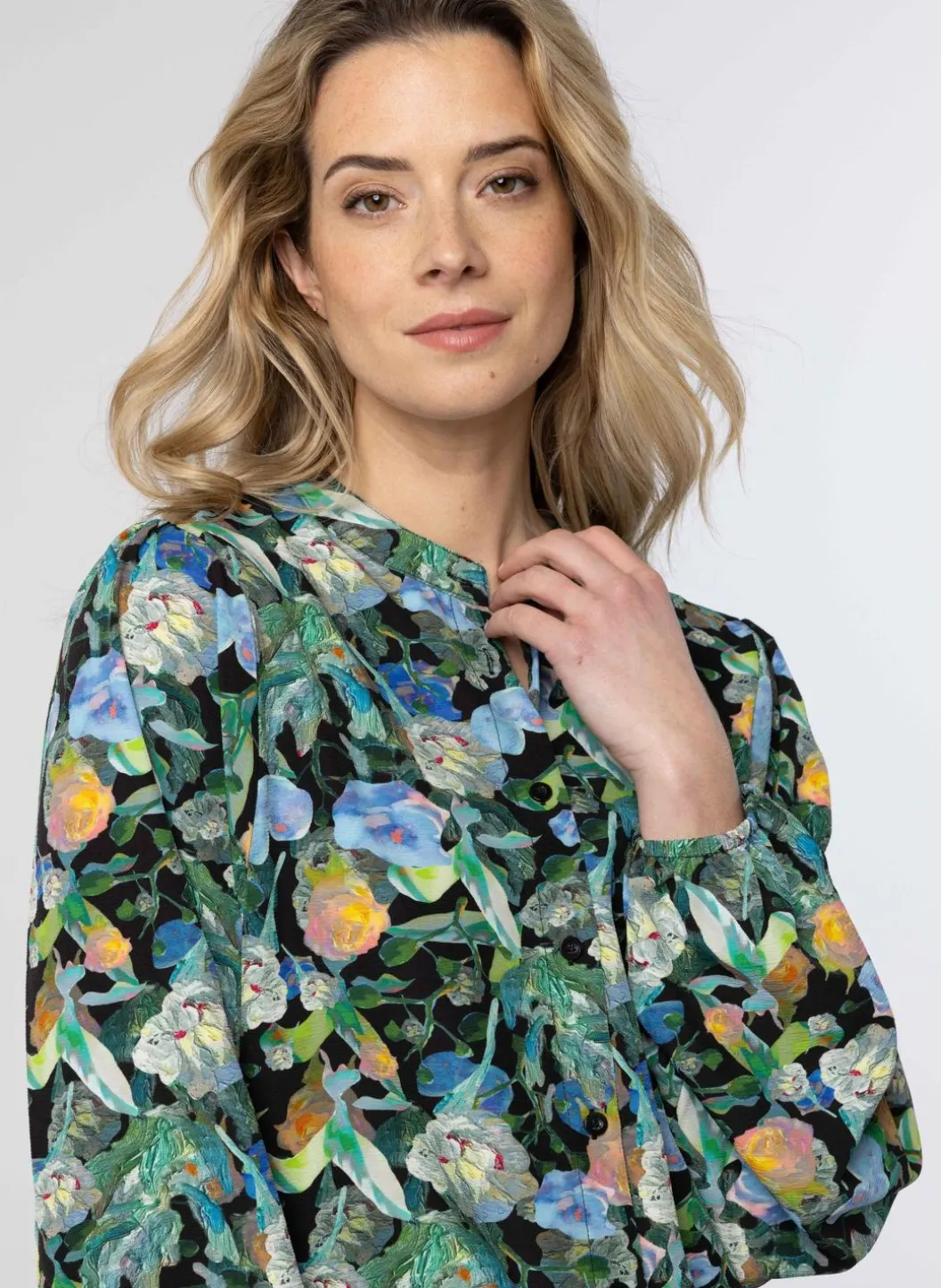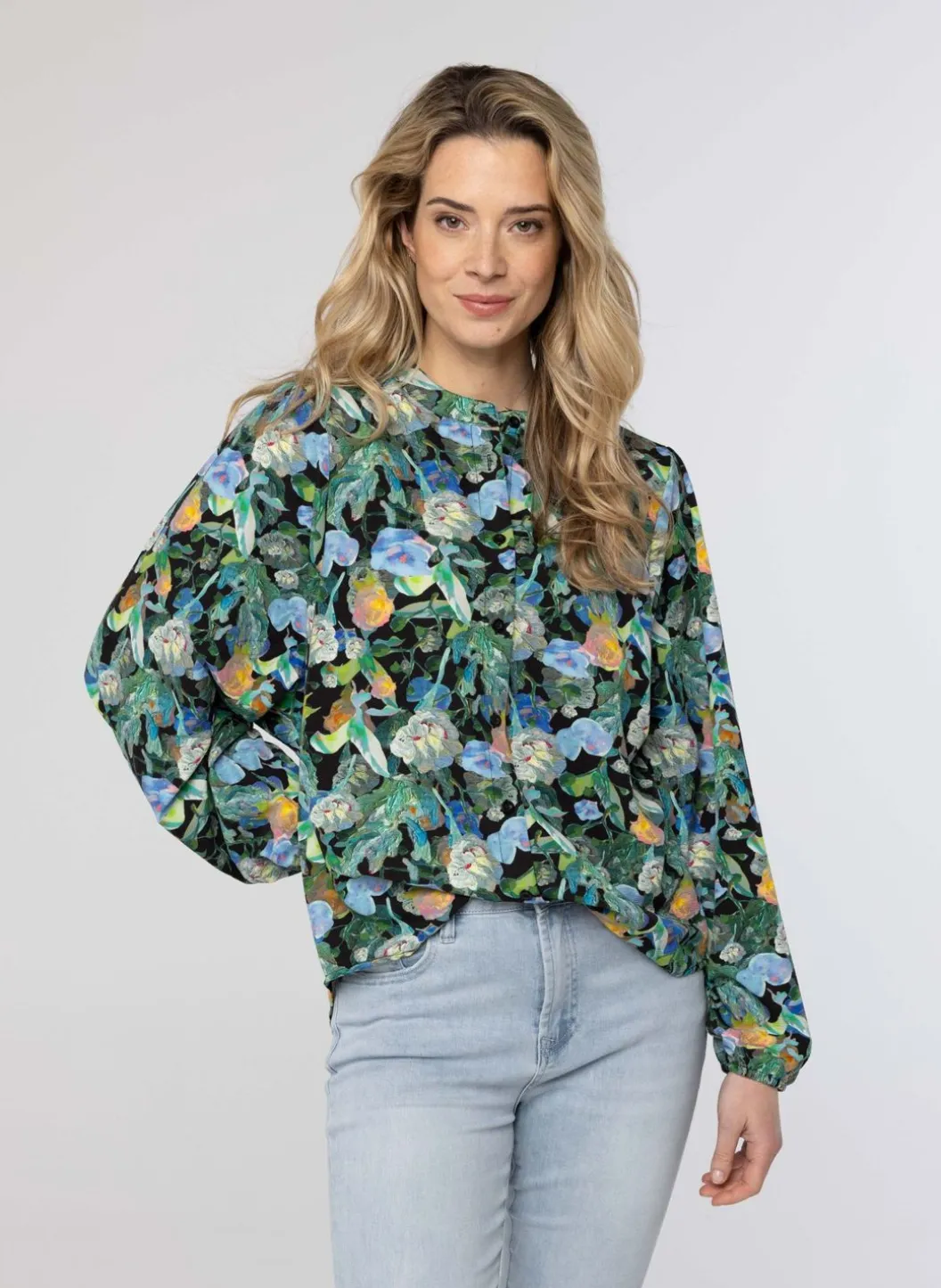 Deze Zwarte Blouse Heeft Een Bloemenprint Met De Kleuren Groen, Blauw, Roze En Geel. De Blouse Heeft Een Ronde Halslijn Met Knoopsluiting En Lange Mouwen Met Elastieken Band. In Deze Print Hebben We Ook Een Shirt.