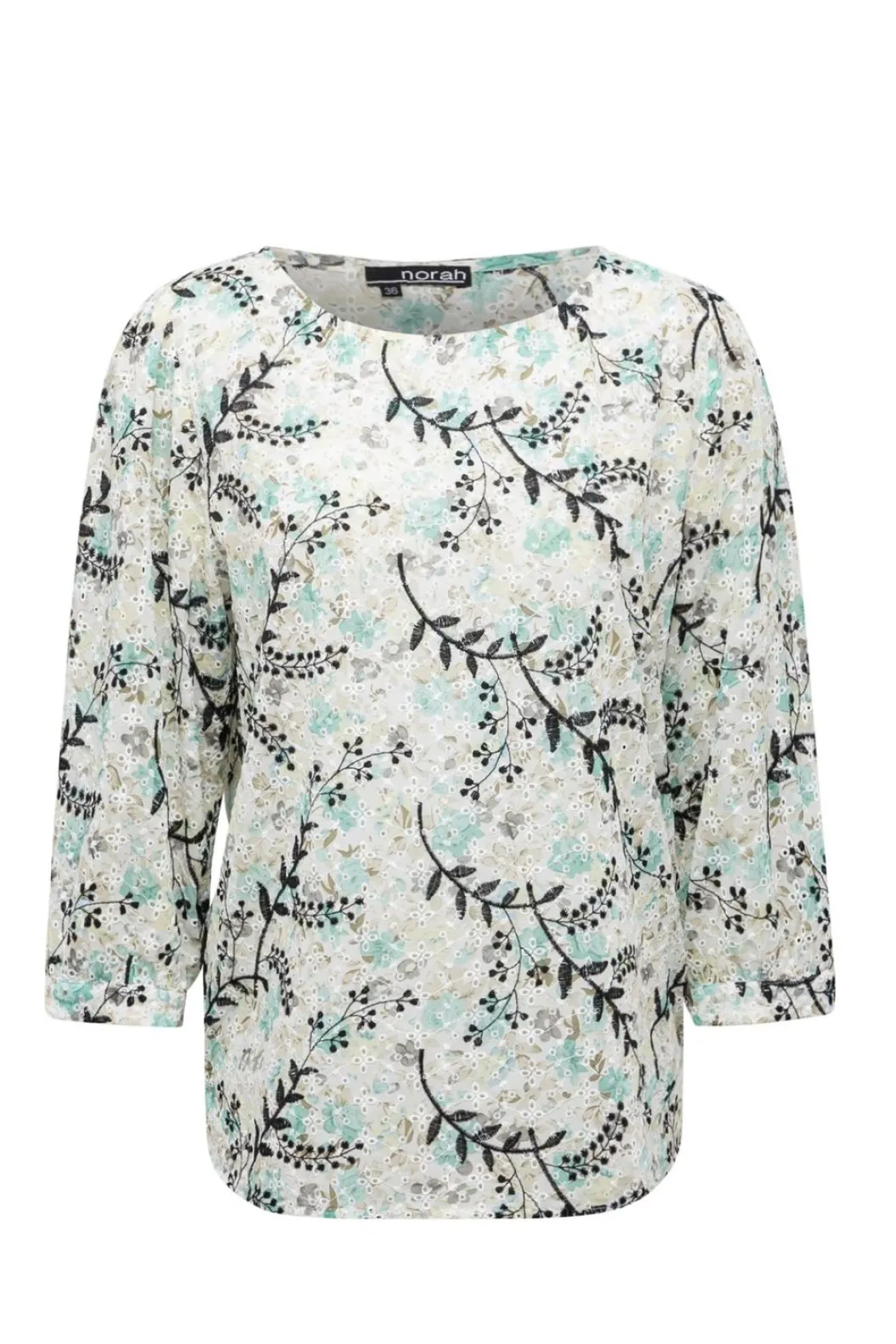 Een Licht Doorschijnende Blouse Met Open Borduursels En Een Bloemenprint. De Blouse Heeft Een Ronde Halslijn En Driekwart Mouwen Met Een Split Manchet Met Knoopsluiting. De Blouse Valt Los.