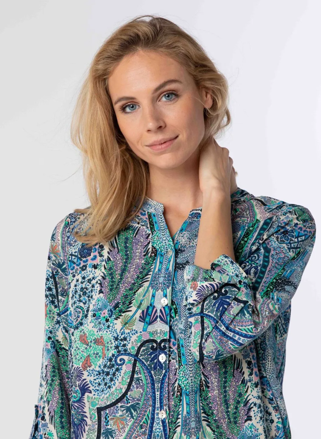 Een Lange Blouse Met Een Lichte Stretch, Voorzien Van Een Flatterende V-Hals En Een Knoopsluiting. De Blouse Heeft Driekwartsmouwen Met Een Oprolbaar Ontwerp, Waardoor De Mouwlengte Verstelbaar Is. Perfect Voor Veelzijdige Stylingsopties En Een Comfortabele Pasvorm.