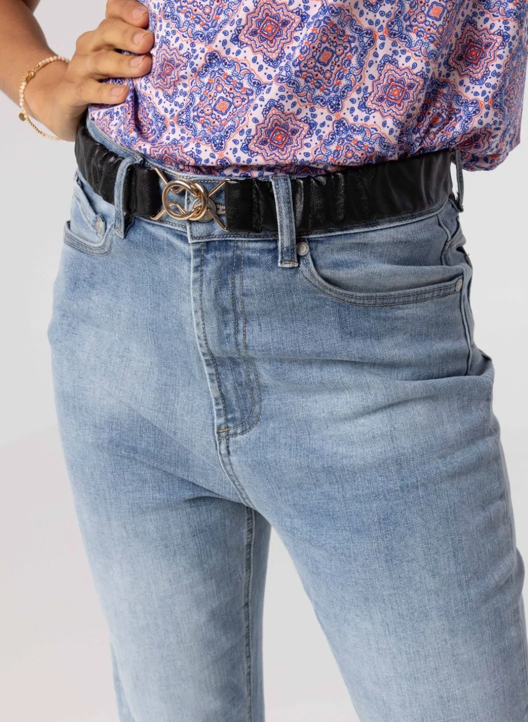 Zwarte Riem Met Leren Look En Gouden Sluiting. De Riem Bevat Veel Stretch. Deze Riem Hebben We Ook In Een Blauwe Kleur.