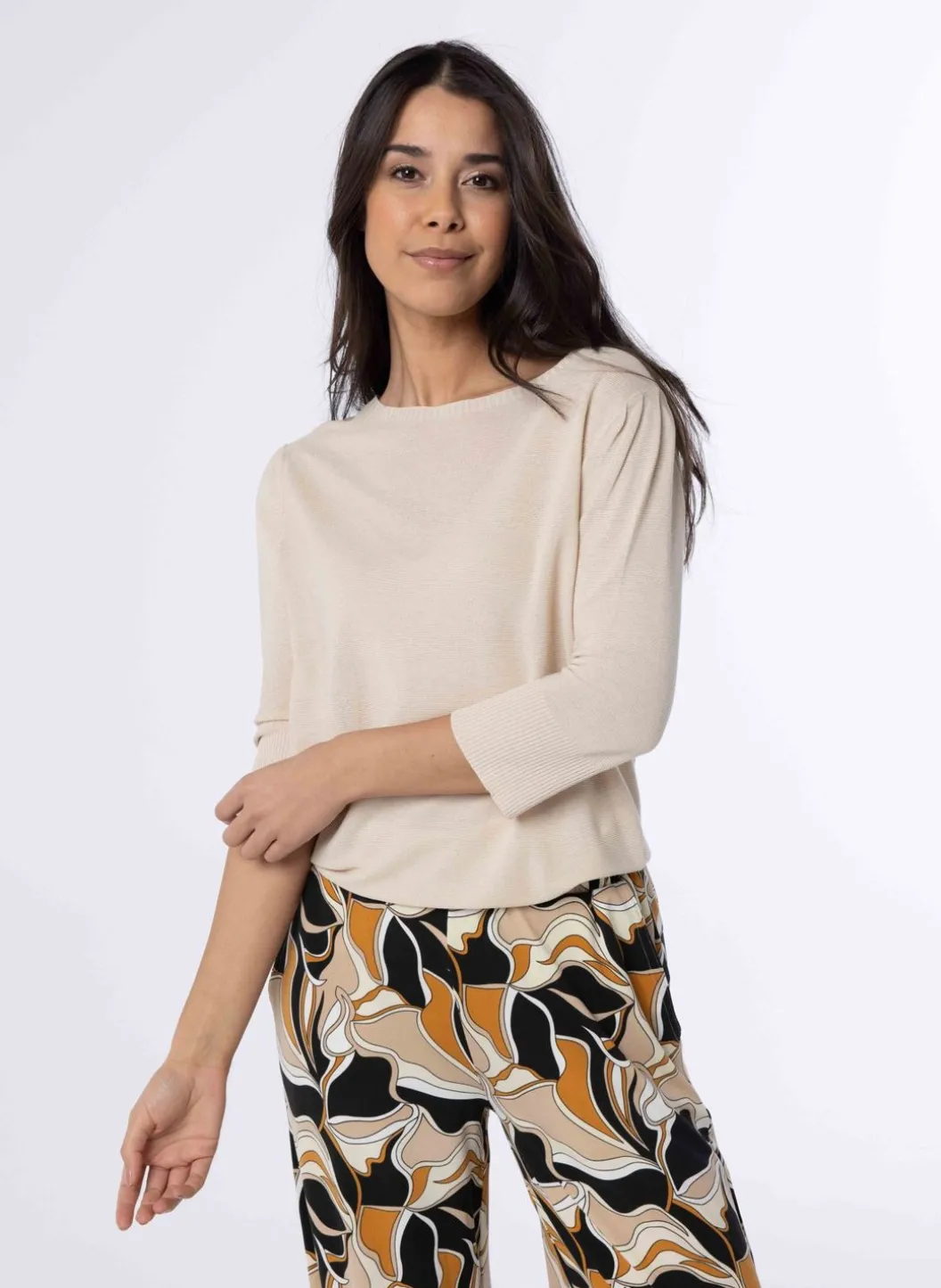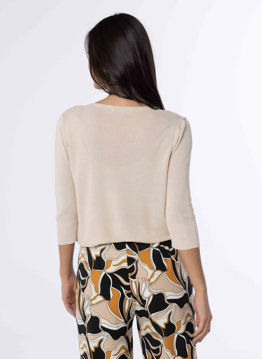 Een Prachtig Gebreide Trui Met Een Klassieke Ronde Halslijn. De Trui Heeft Een Subtiele Doorschijnendheid, Wat Een Vleugje Elegantie Aan Het Ontwerp Toevoegt. Het Heeft Mouwen Van Halve Lengte, Delicaat Afgewerkt Met Een Geribbelde Manchet, Wat Een Stijlvolle En Verfijnde Touch Geeft Aan Dit Garderobe-Essentieel.