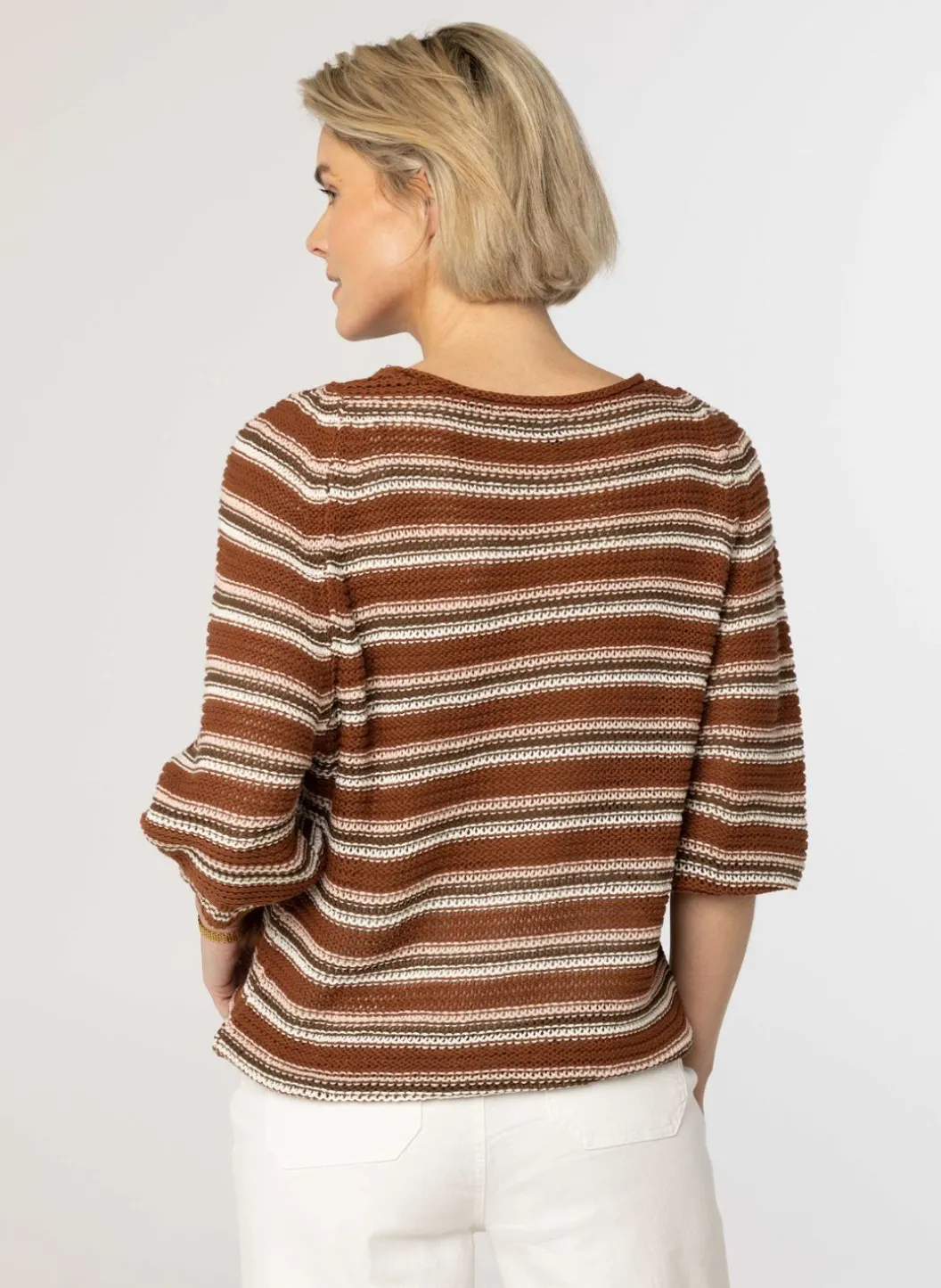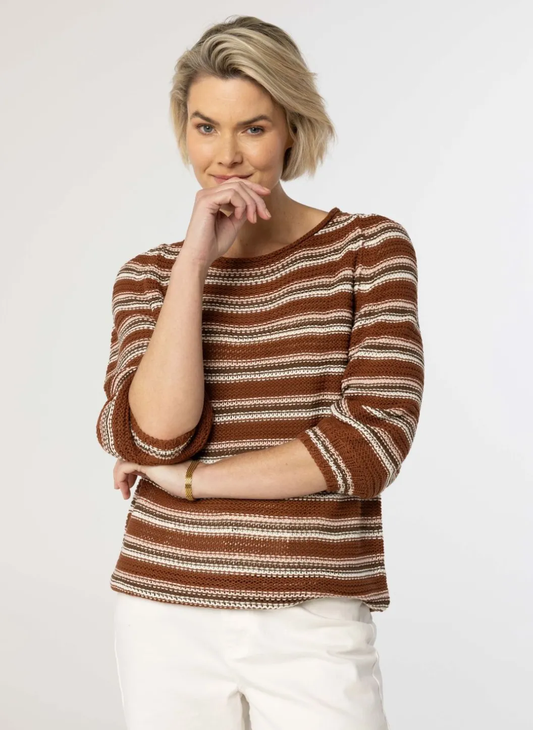Deze Gebreide Trui Met Ronde Halslijn En Halflange Mouwen Heeft Een Streeppatroon. De Kleuren Lichtroze, Donkerbruin, Taupe En Wit Zijn In De Gebreide Trui Verwerkt.