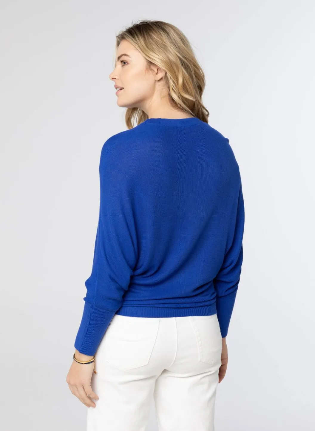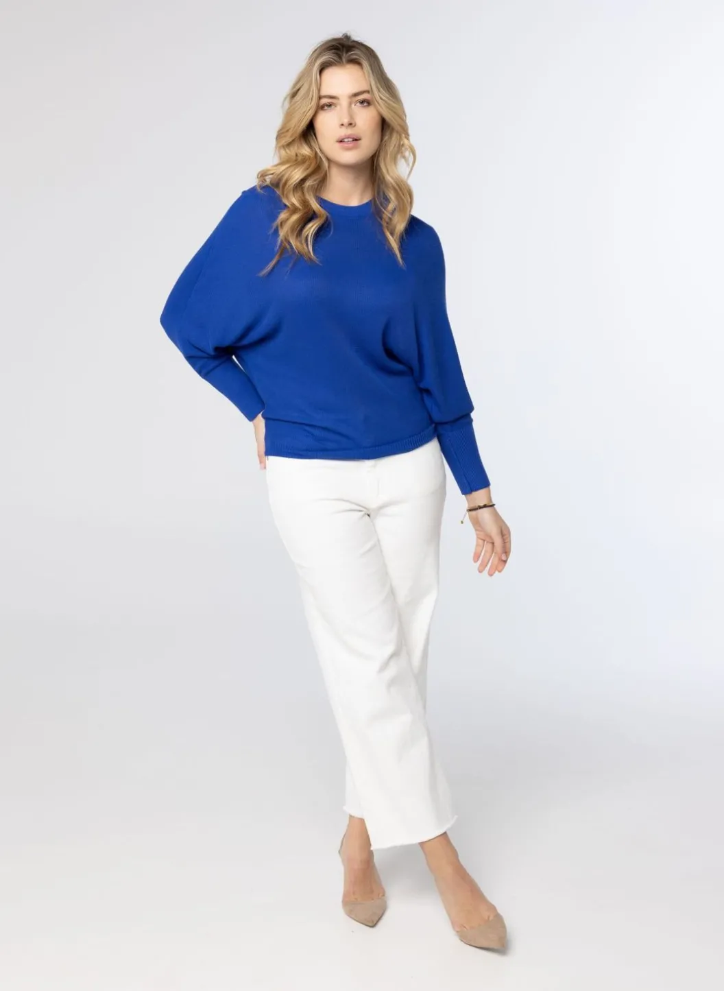 Deze Gebreide Kobaltblauwe Trui Heeft Een Ronde Halslijn En Lange Aangeknipte Vleermuismouwen.
