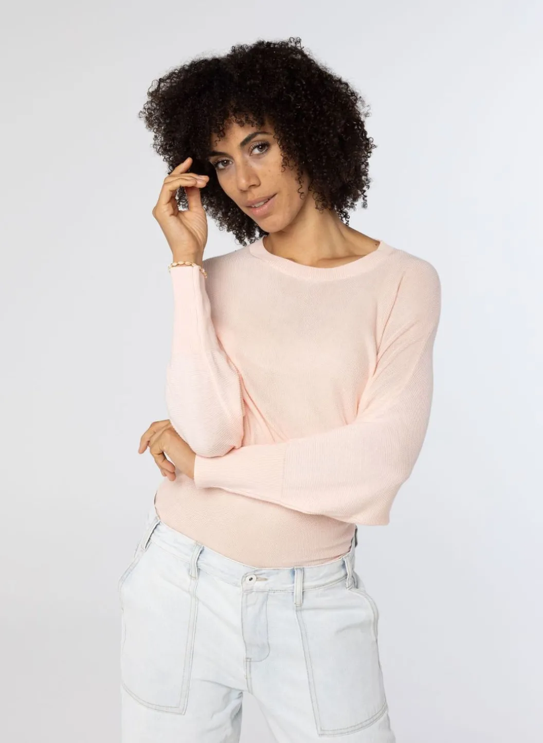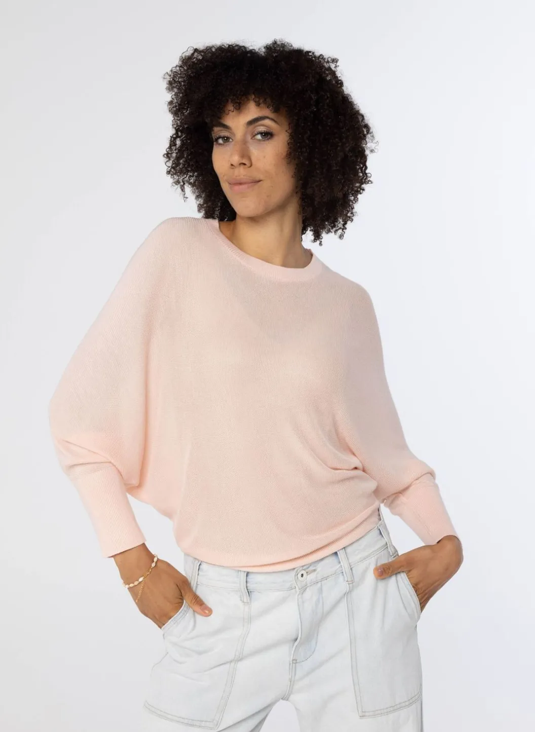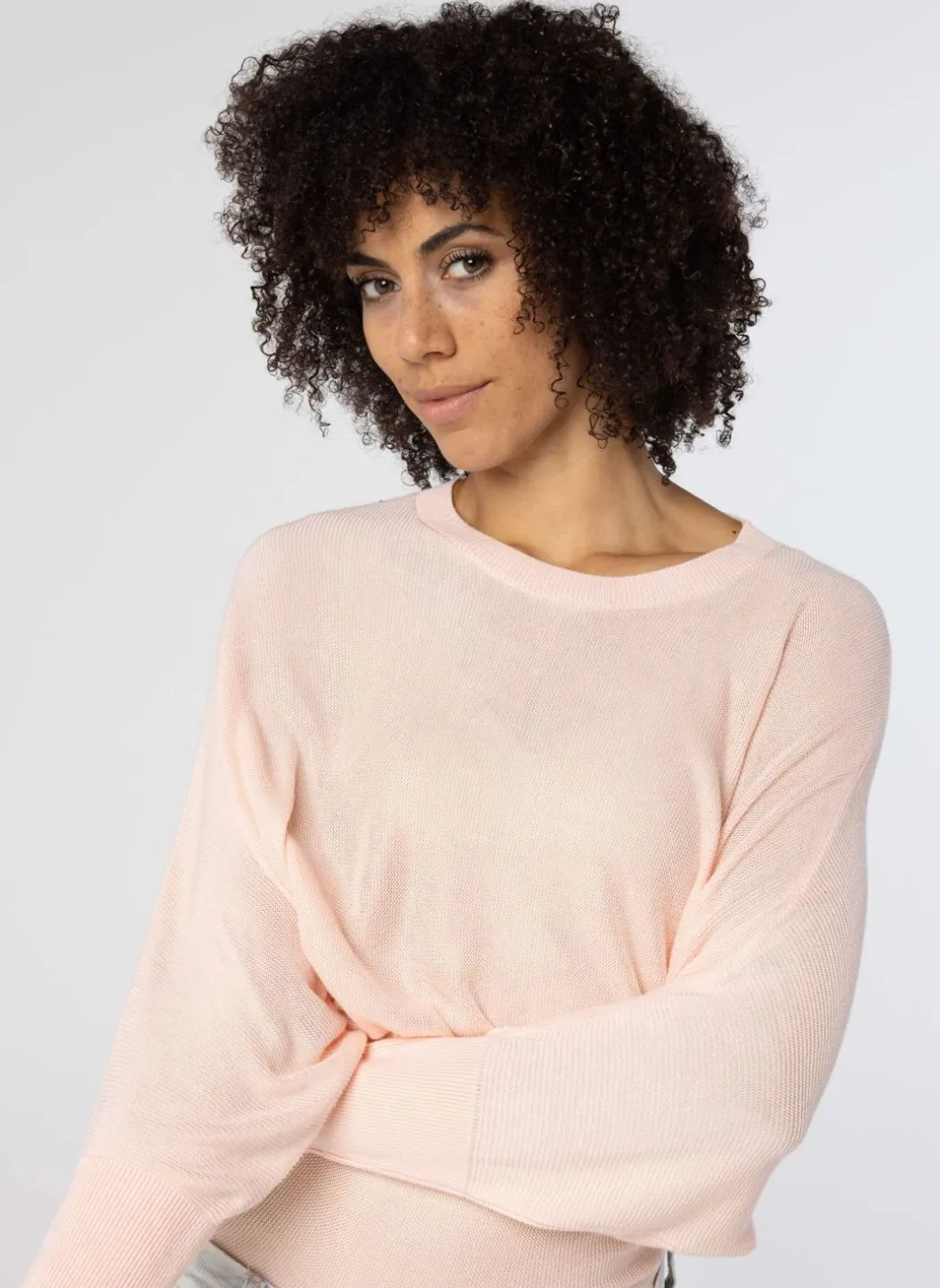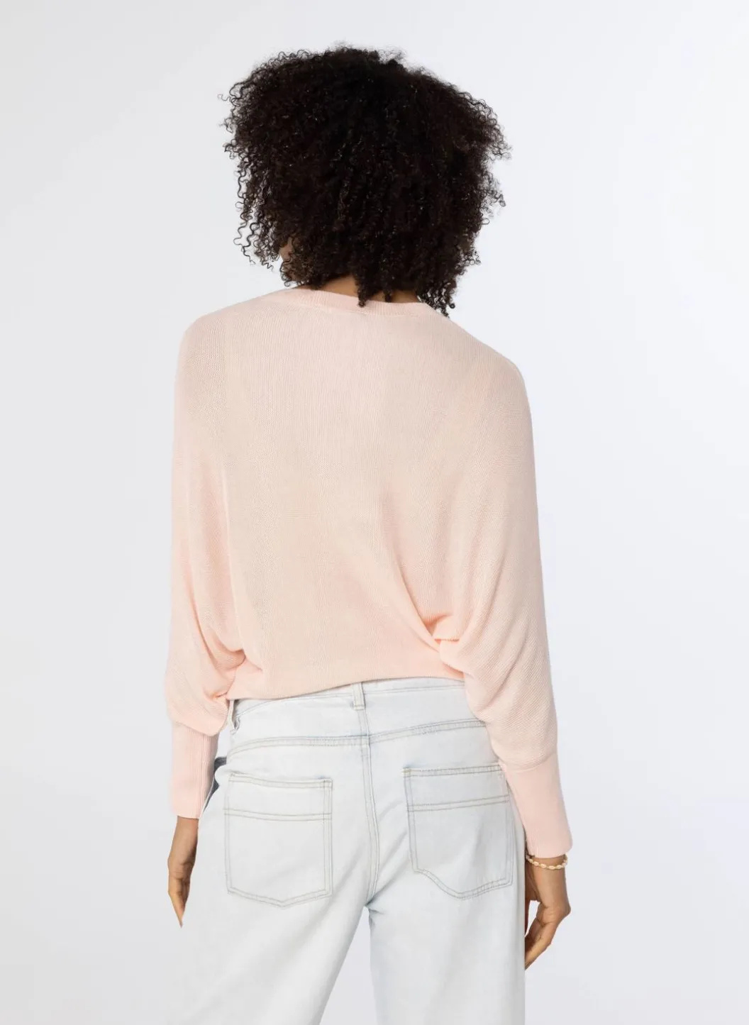 Deze Voile Zachtroze Gebreide Trui Met Lange Vleermuismouw Heeft Een Ronde Halslijn.