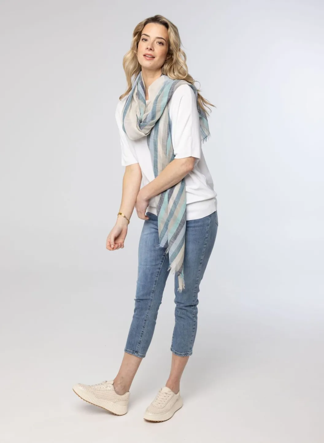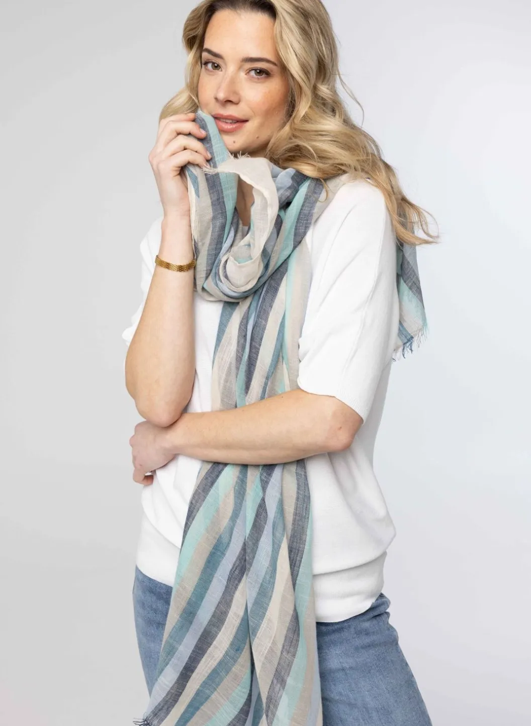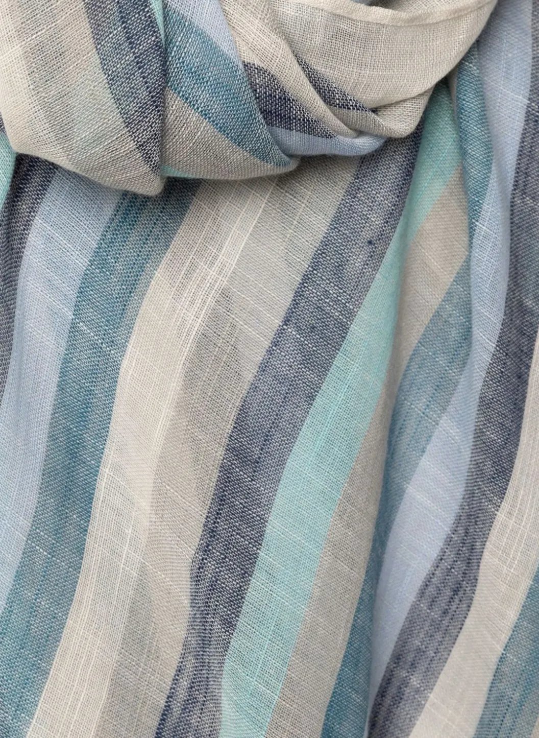Gestreepte Dungeweven Sjaal Met Ecru, Grijs En Diverse Tinten Blauw. De Sjaal Heeft Een Rafelrand.