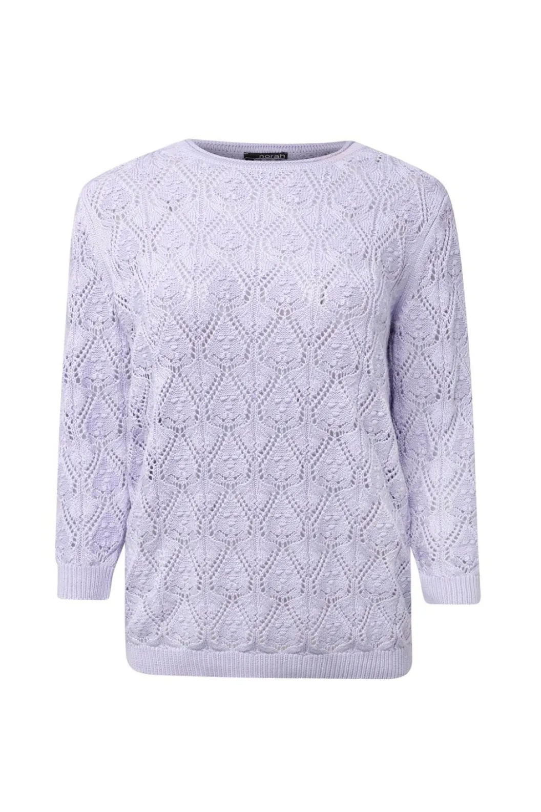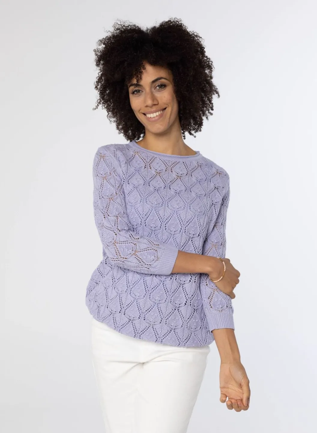 Deze Opengebreide Lila Trui Heeft Driekwart Mouwen, Een Ronde Hals En En Heeft Stretch.