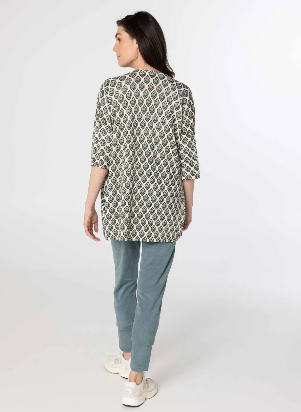 Een Meerkleurig Vest Gemaakt Van Een Elastische Stof Met Halflange Mouwen. De Aanwezige Kleuren Zijn Lichtroze, Lichtgroen En Donkergroen. Het Vest Valt Op Heuplengte En Is Te Combineren Met Een Shirt Met Dezelfde Grafische Print.