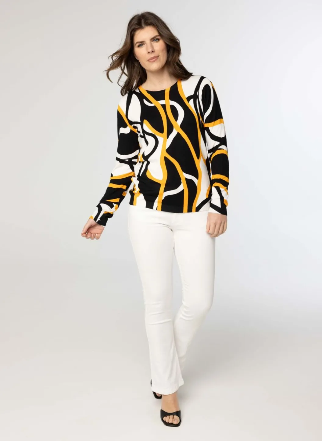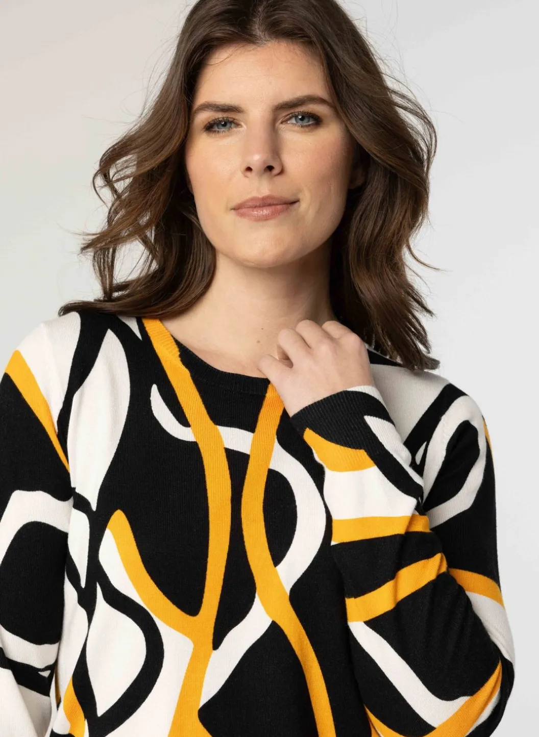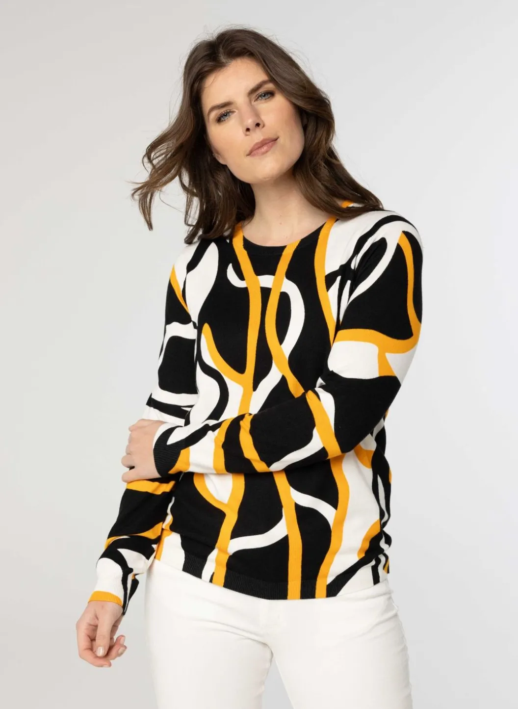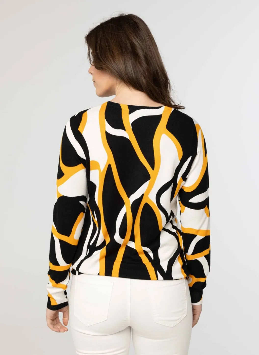De Trui Met Grafische Print In Drie Kleuren Heeft Lange Mouwen En Een Ronde Halslijn.