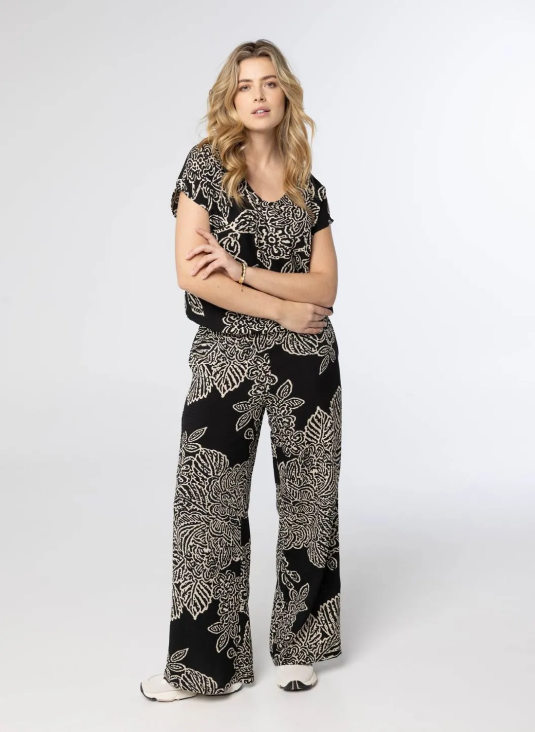 Deze Zwarte Pantalon Heeft Een Ecru Kleurige Print. De Broek Heeft Een Elastieken Band Achter Op Taillehoogte En Twee Steekzakken. De Broek Is Licht Doorschijnend En Is Onderdeel Van Een Co-Ord Set. Maak De Co-Ord Set Compleet Met Het Shirt.