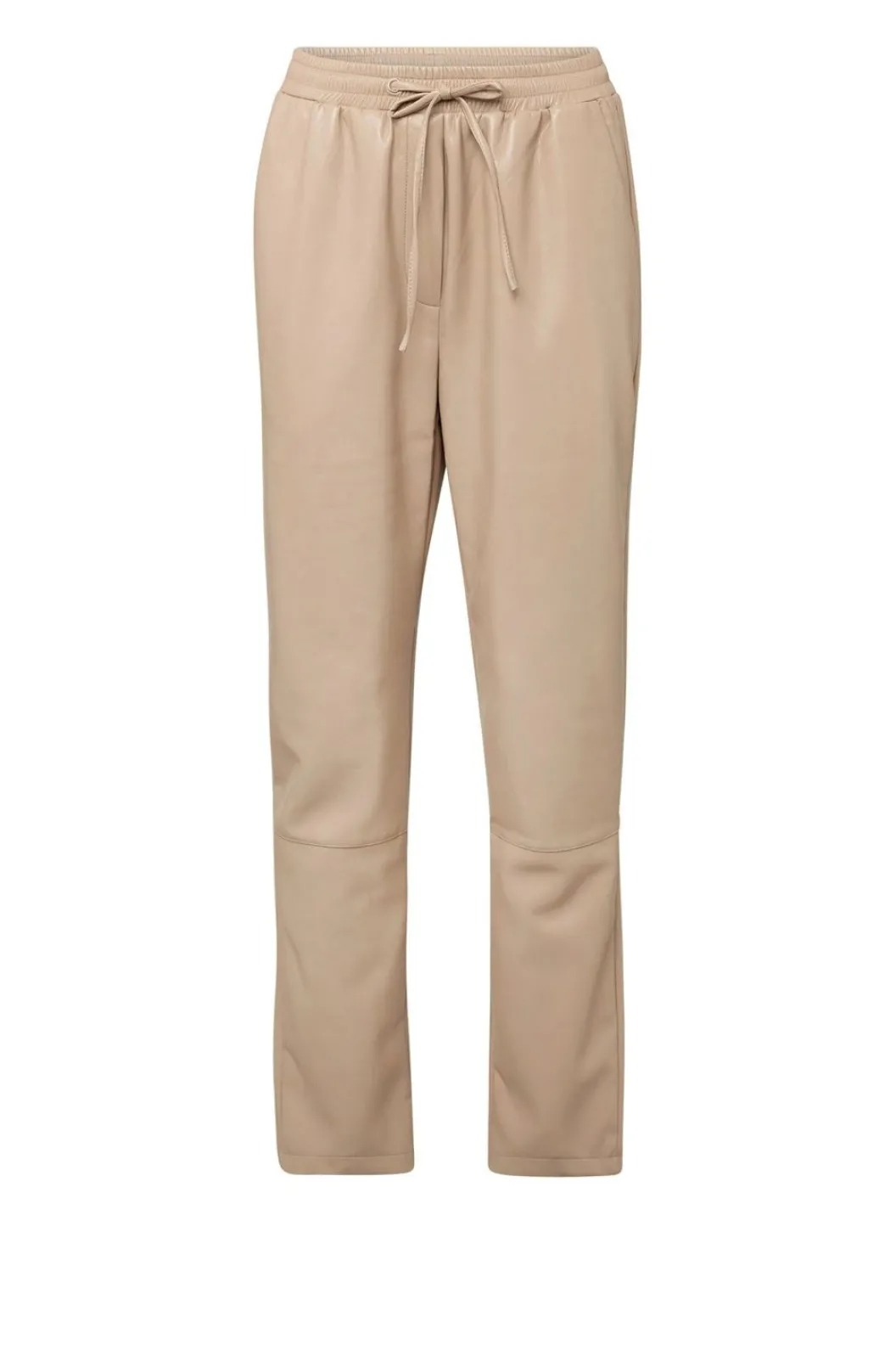 Deze Beigekleurige Pu Broek Heeft Twee Steekzakken Aan De Voorzijde En Twee Paspelzakken Aan De Achterzijde. De Roek Heeft Een Elastieken Band Met Trekkoord. Op Het Onderbeen Is Een Naad Aangebracht Wat De Stof Breekt.