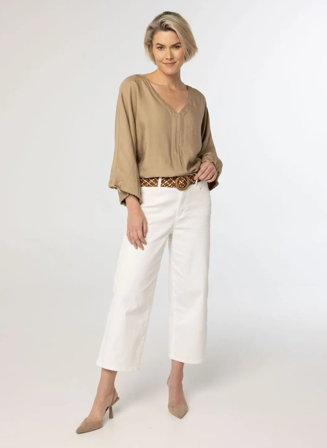 Deze Gevlochten Riem Van Bruin En Ecru Wordt Gesloten Met Een Ronde Houten Gesp.