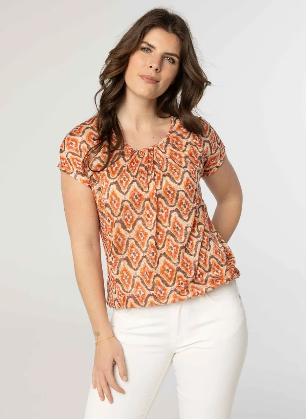 Dit Lichte Shirt Met Aangeknipte Mouw Valt Soepel Langs Het Lichaam. In De Grafische Print Zijn De Kleuren Rood, Oranje, Beige, Bruin Verwerkt. Het Shirt Heeft Een Ronde Plooiende Halslijn En Een Elastieken Band Onderaan Die Een Poffend Effect Geeft. Het Shirt Is Licht Doorschijnend. In Deze Print Hebben We Ook Een Jurk.