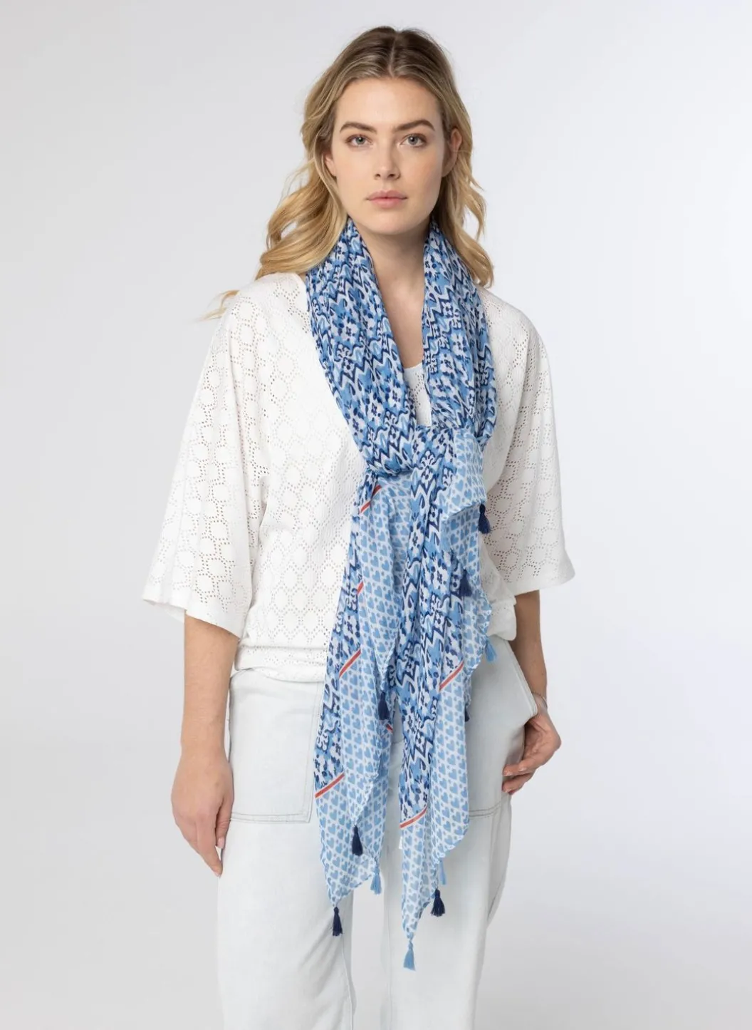 Blauwe Dungeweven Sjaal Met Diverse Grafische Prints En Tassels.