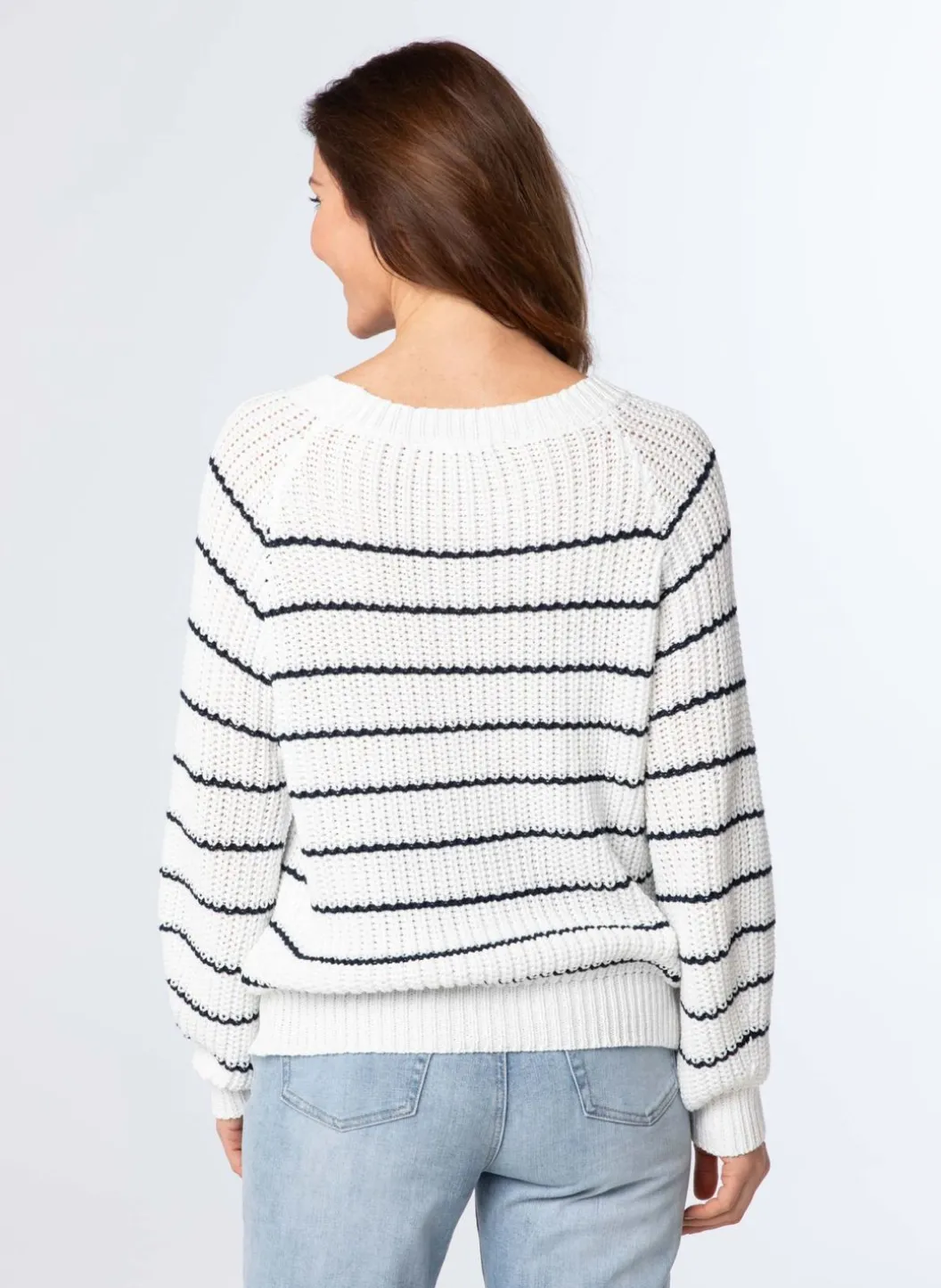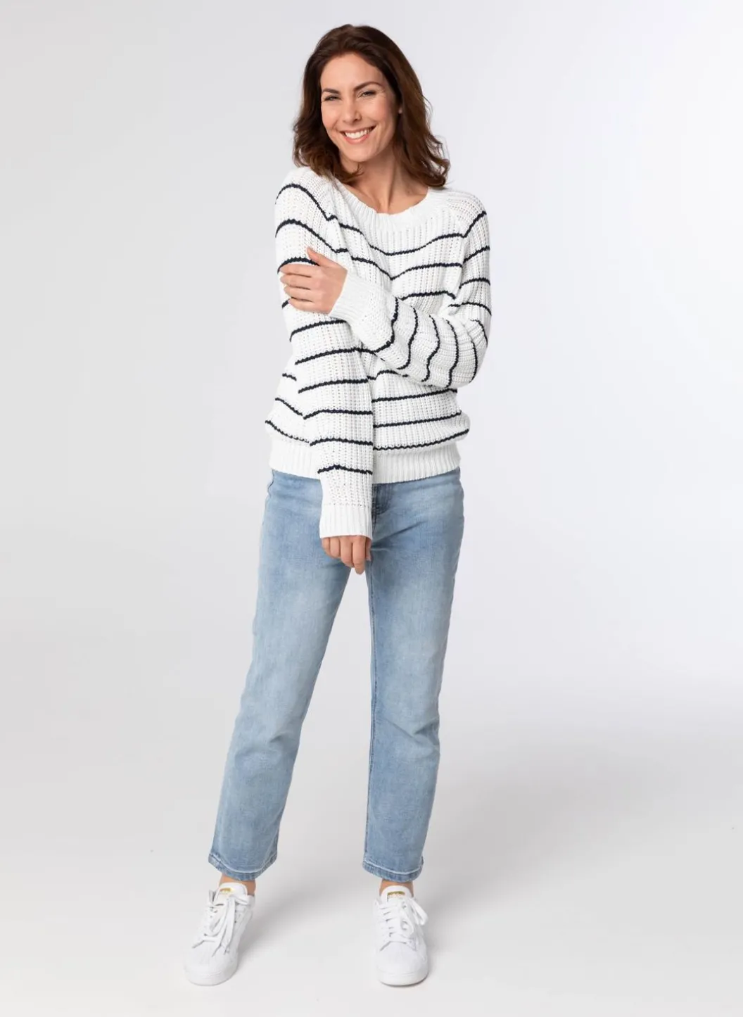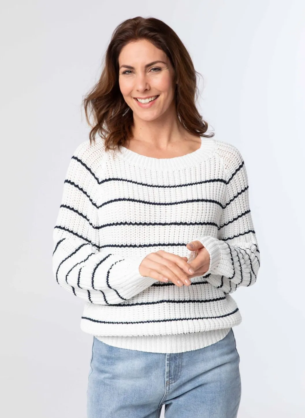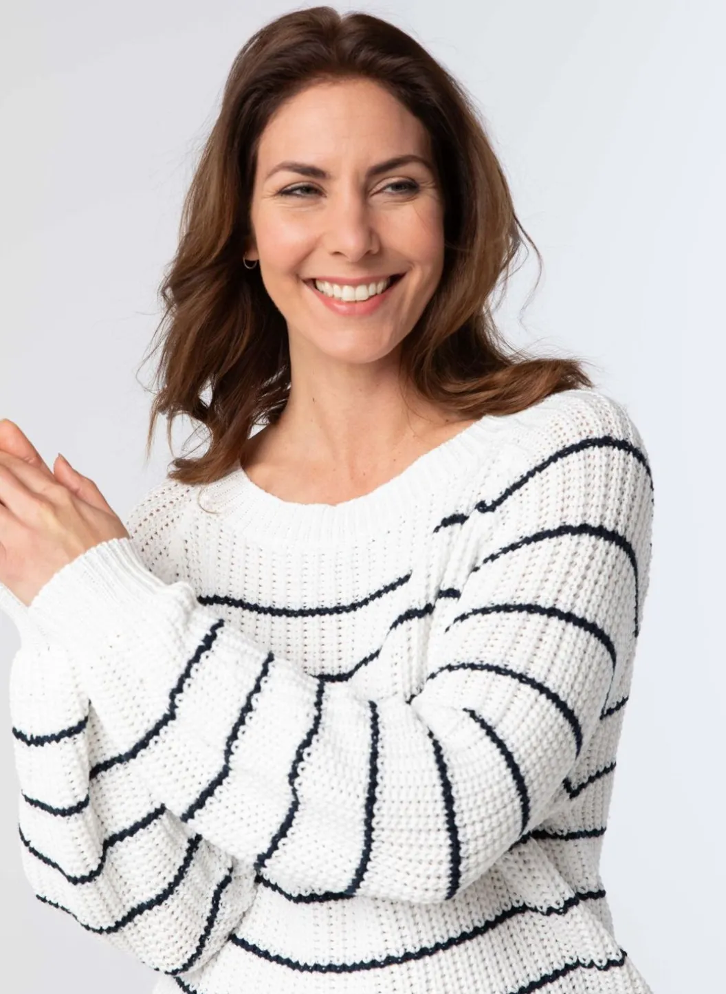 Een Gezellige En Stijlvolle Dikke Gebreide Trui In Een Leuke Gestreepte Print. Deze Trendy Trui Heeft Een Comfortabele Ronde Halslijn En Lange Mouwen, Afgewerkt Met Een Brede Geribbelde Zoom. Perfect Om Je Warm En Modieus Te Houden Tijdens De Koudere Maanden.
