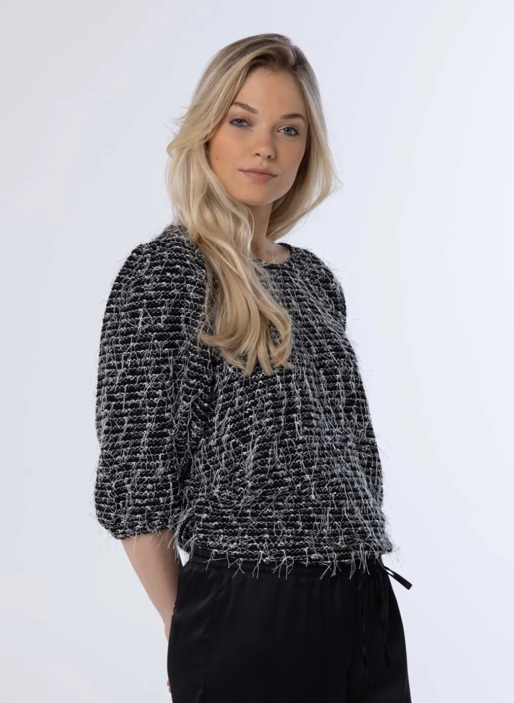 Een Gezellige Trui Met Een Ronde Halslijn En Halflange Mouwen. De Trui Heeft Losse Draden Die Een Speels En Verrassend Effect Creëren, Waardoor Je Outfit Een Vleugje Speelsheid Krijgt. Gemaakt Van Zacht En Warm Materiaal, Is Deze Trui Perfect Om Stijlvol En Comfortabel Te Blijven In Elk Seizoen.