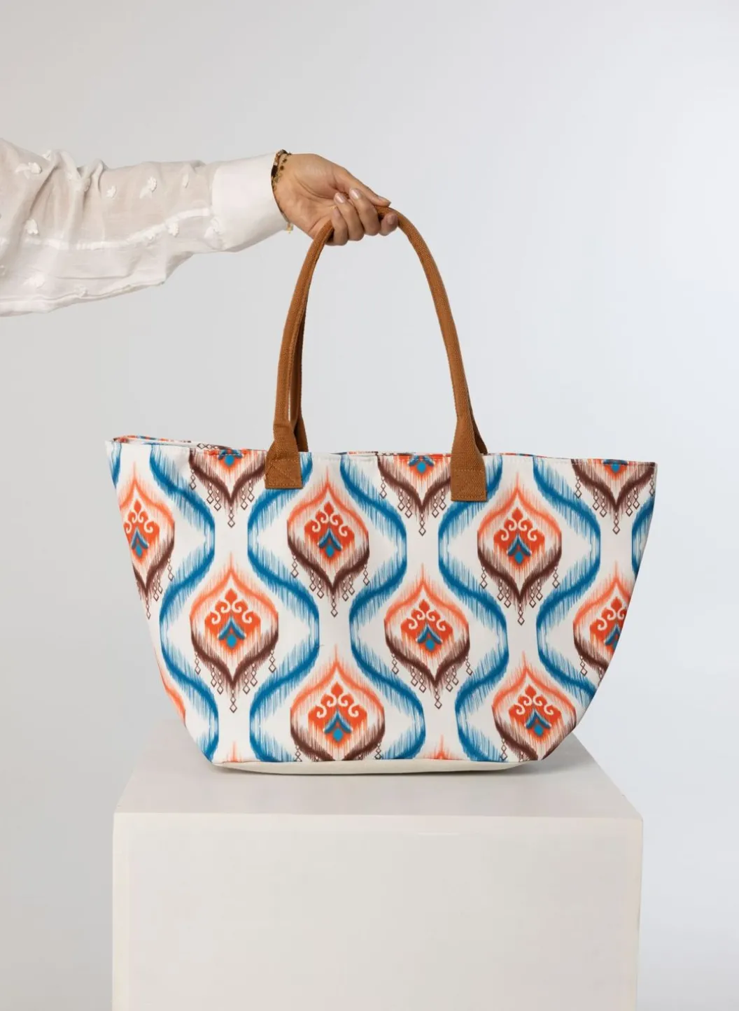 Deze Grote Canvas Shopper Kan Gesloten Worden Middels Een Ritssluiting. De Tas Heeft Lange Bruine Hengsels. De Tas Heeft Een Open Binnenvak En Bestaat Uit De Kleuren Bruin, Blauw, Oranje En Wit.