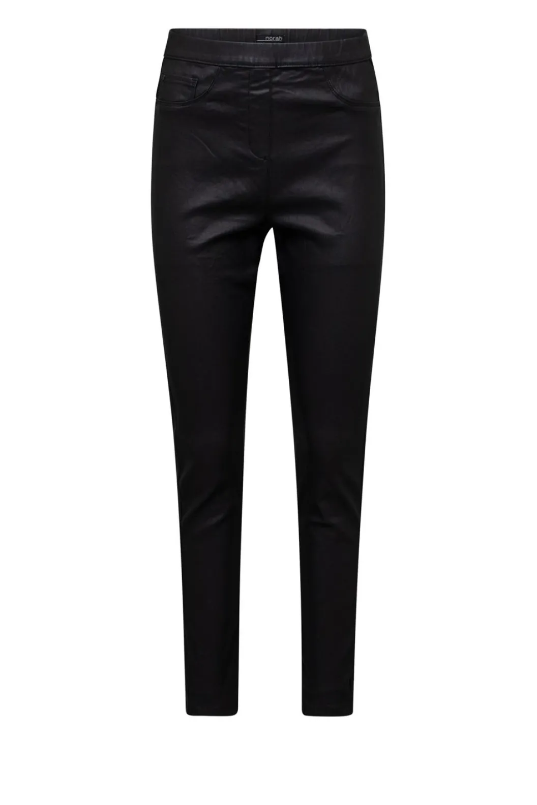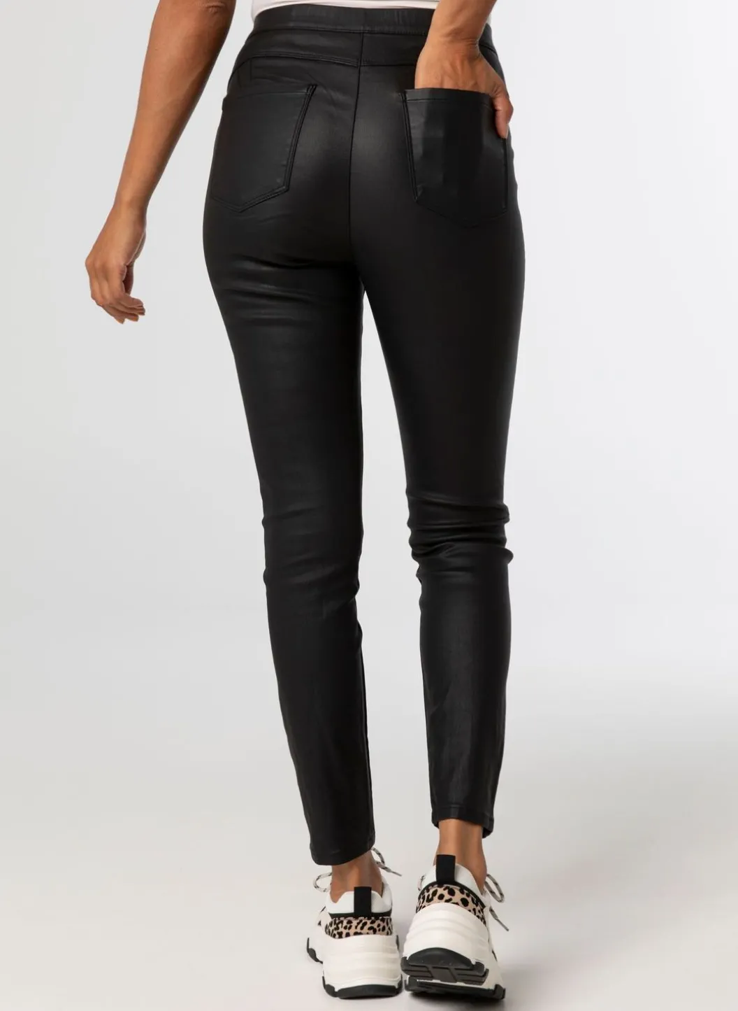 Een Skinny Fit Broek Met Glanzende Coating En Een Elastische Tailleband. Deze Broek Heeft Kontzakken Op De Achterkant En Sierzakken Op De Voorkant.
