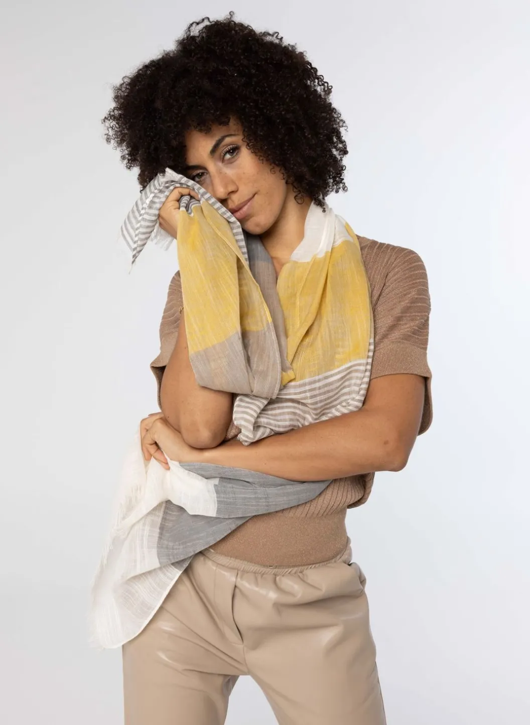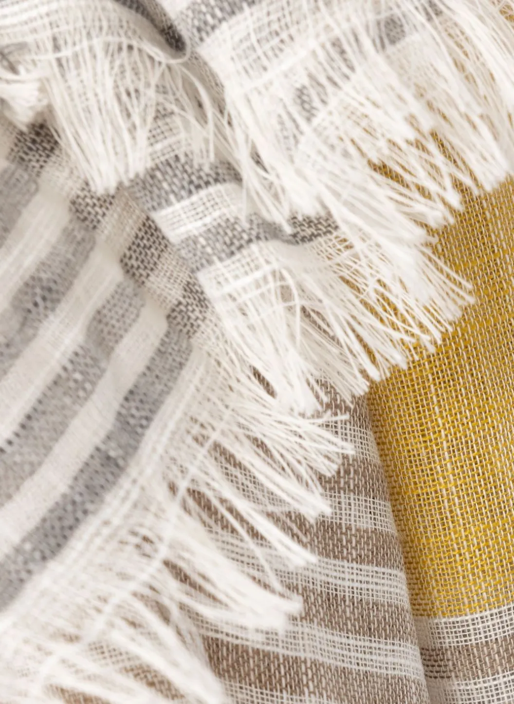 Een Dun Geweven Sjaal Met Streeppatroon. De Kleuren Wit, Bruin En Geel Zijn Verwerkt In De Sjaal.