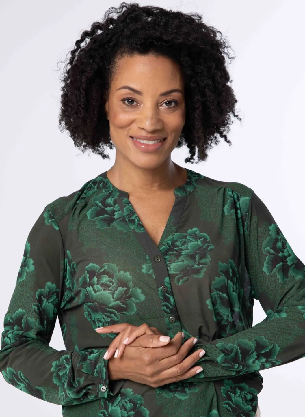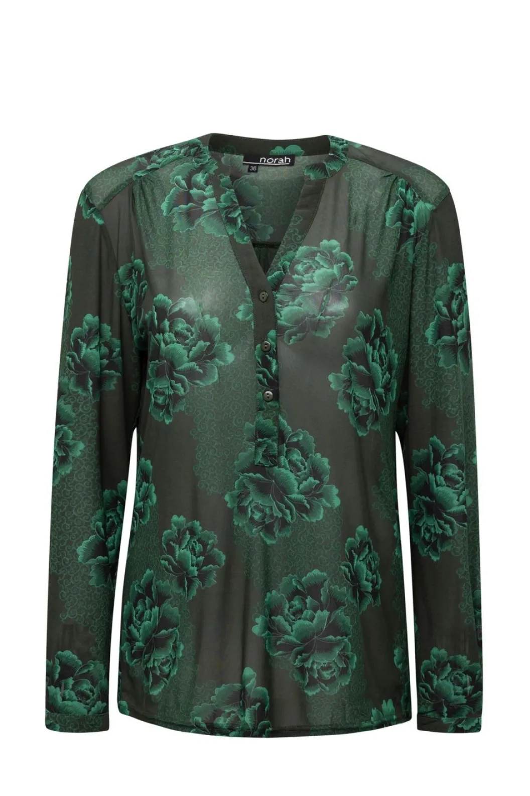 Een Transparante Blouse Met Een Levendige Bloemenprint. De Schouders Zijn Versierd Met Gestikte Plooien, Wat Een Vleugje Elegantie Toevoegt. De Blouse Heeft Lange Mouwen Met Een Splitmanchet En Knoopsluiting, Waardoor Er Veelzijdige Stylingopties Mogelijk Zijn. Daarnaast Heeft Het Een Elegante V-Hals, Prachtig Versierd Met Een Knoopsluiting, Wat De Verfijnde Uitstraling Compleet Maakt.