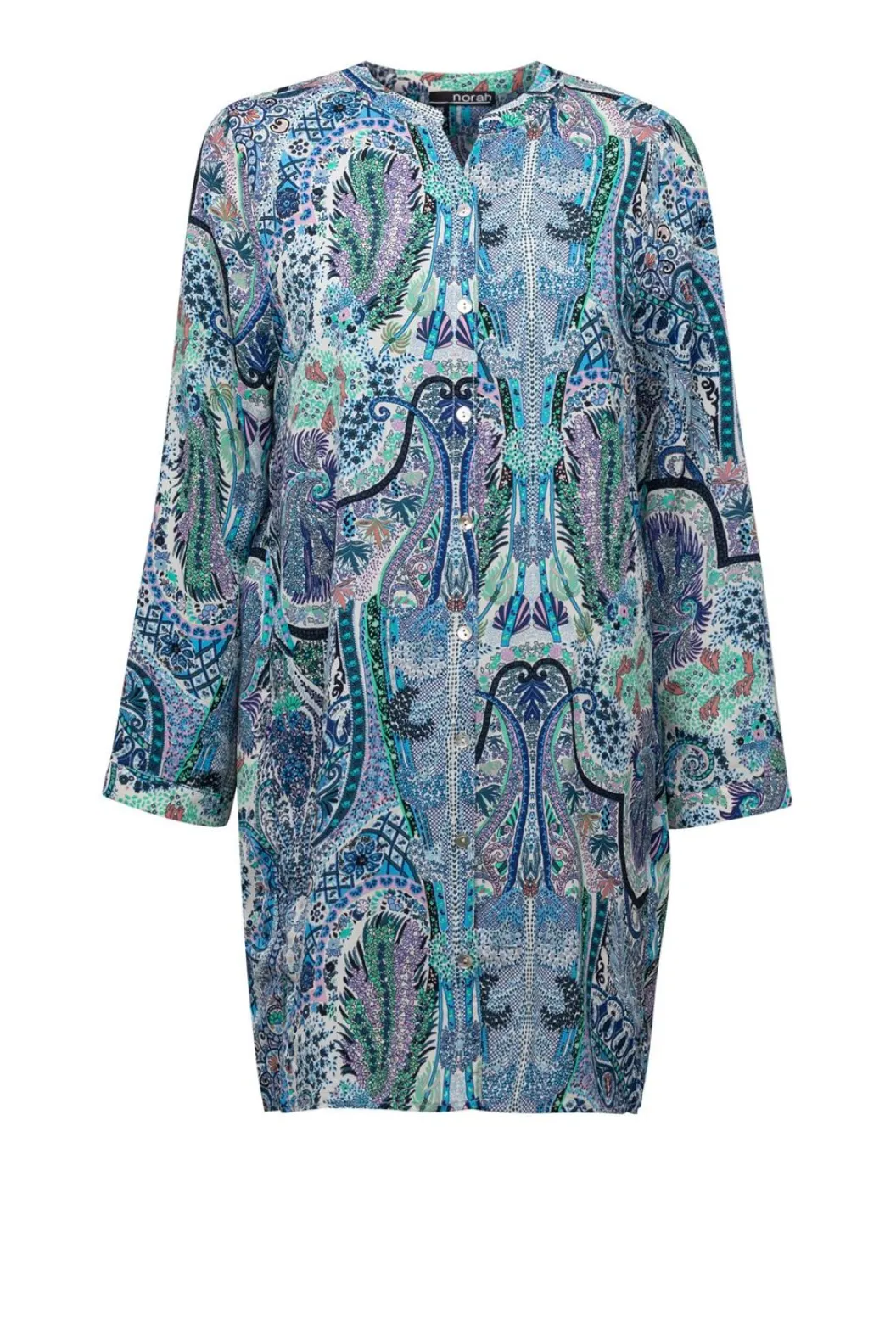 Een Lange Blouse Met Een Lichte Stretch, Voorzien Van Een Flatterende V-Hals En Een Knoopsluiting. De Blouse Heeft Driekwartsmouwen Met Een Oprolbaar Ontwerp, Waardoor De Mouwlengte Verstelbaar Is. Perfect Voor Veelzijdige Stylingsopties En Een Comfortabele Pasvorm.