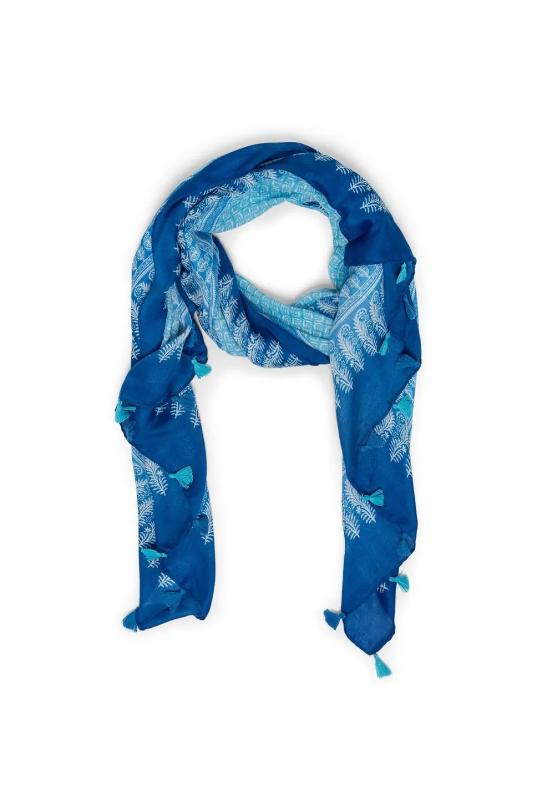 Een Blauwe Lichtgewicht Sjaal, Fijn Geweven Met Een Verbluffende Bloemenprint En Afgewerkt Met Elegante Kwastjes. Dit Modieuze Accessoire Is Perfect Om Een Vleugje Elegantie En Stijl Aan Elke Outfit Toe Te Voegen.