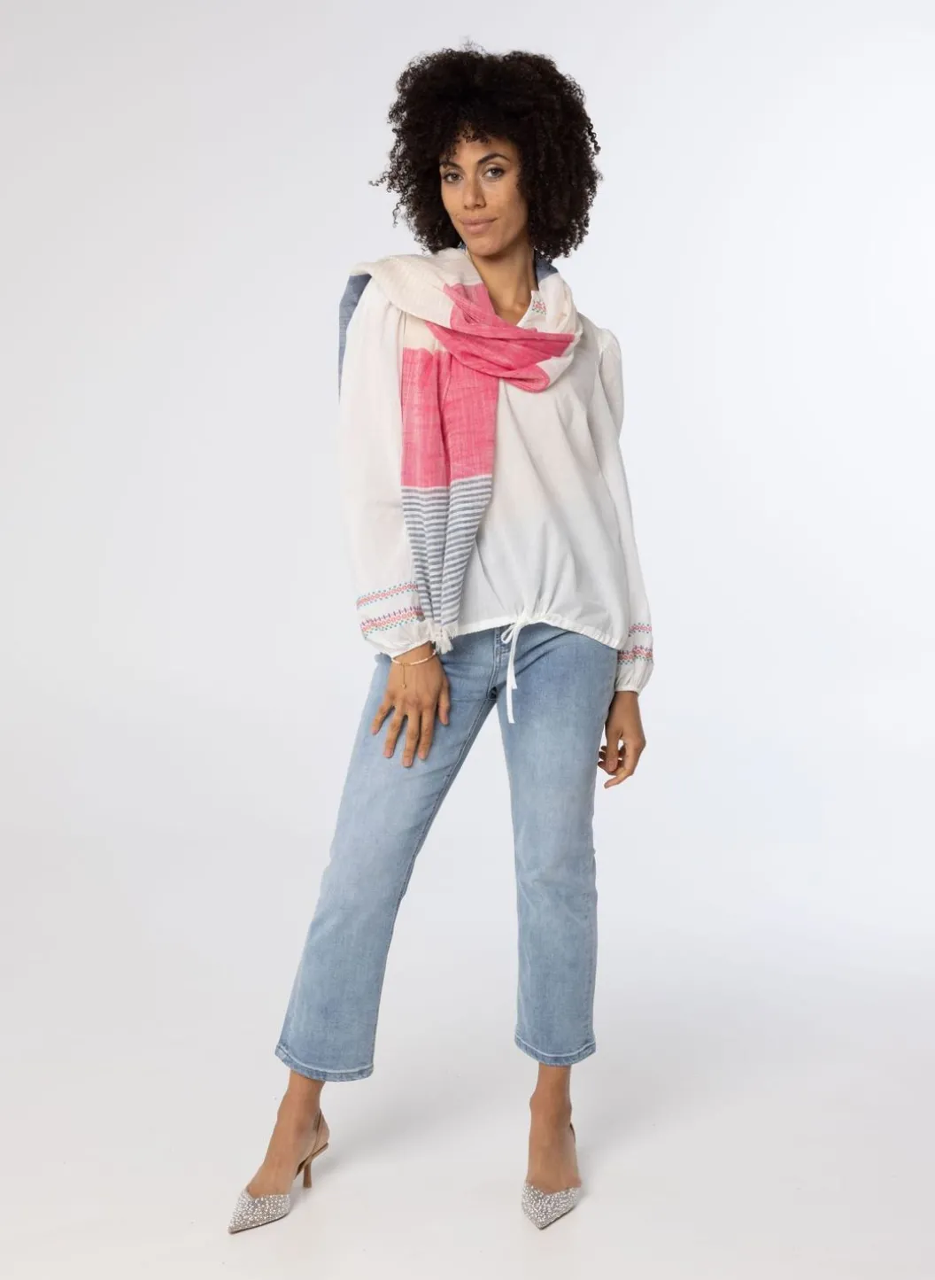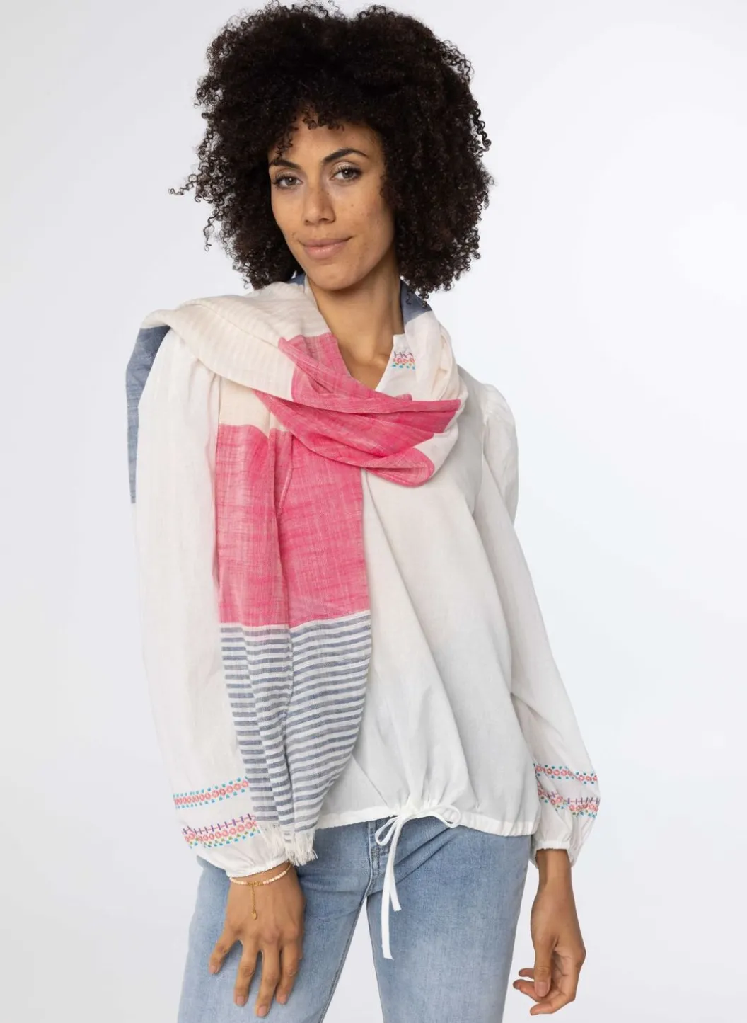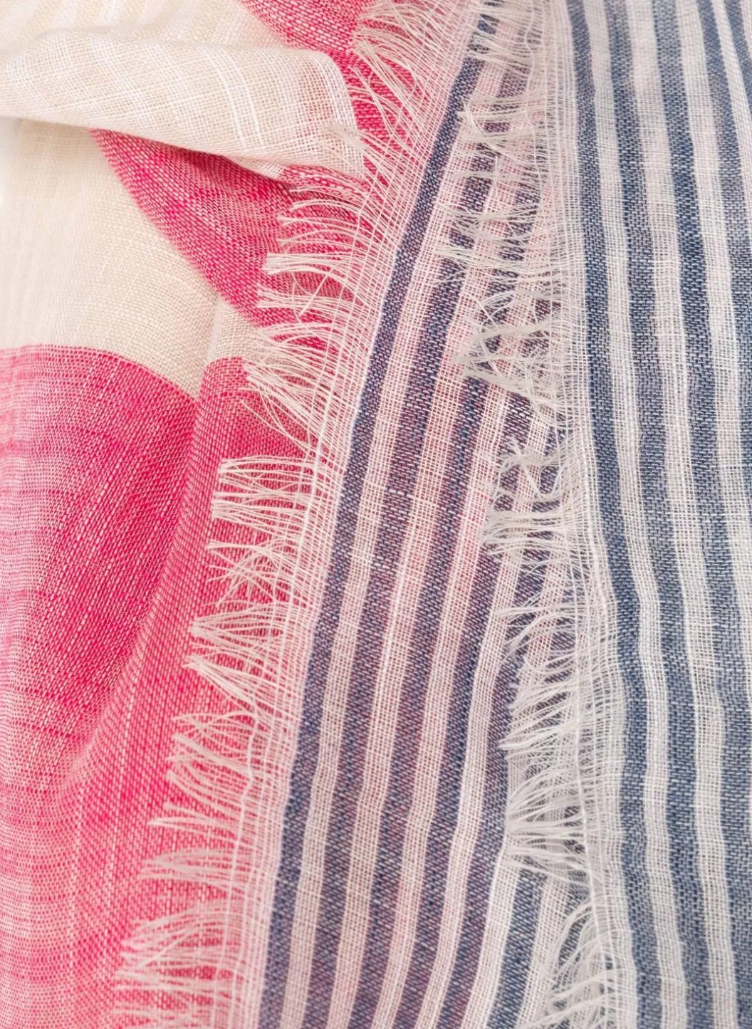 Een Dun Geweven Sjaal Met Streeppatroon. De Kleuren Wit, Blauw, Roze En Beige Zijn In De Sjaal Verwerkt.