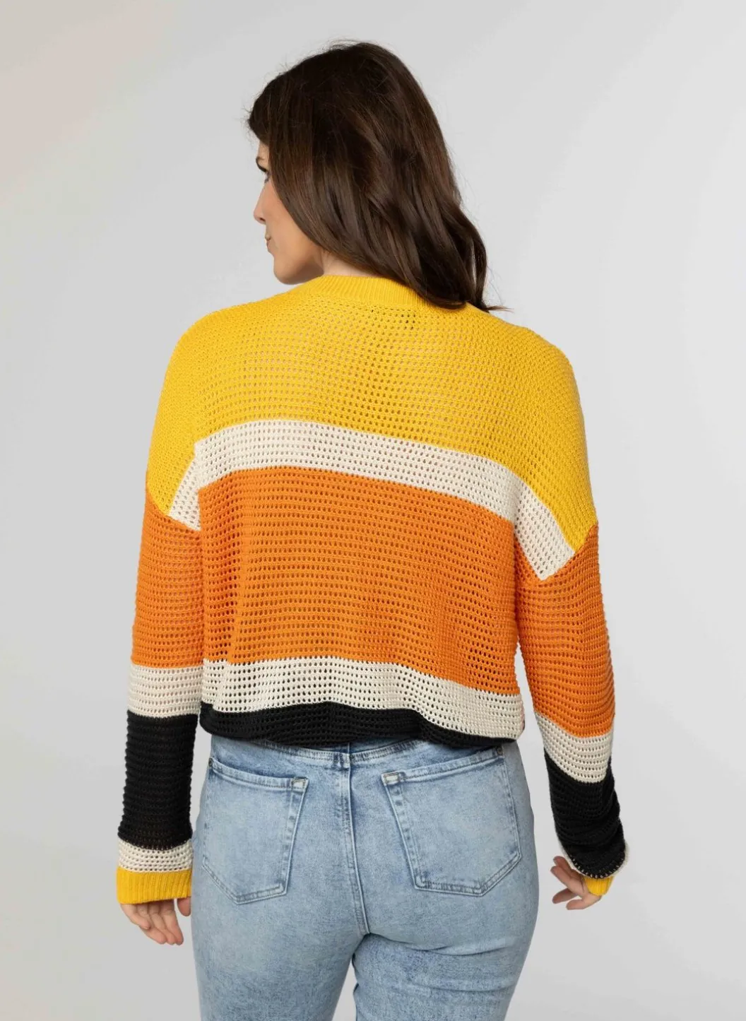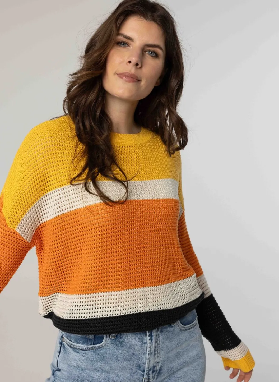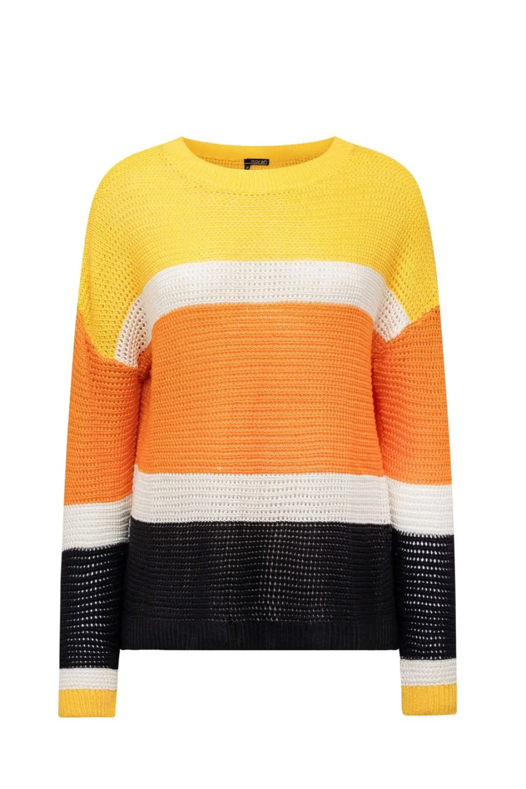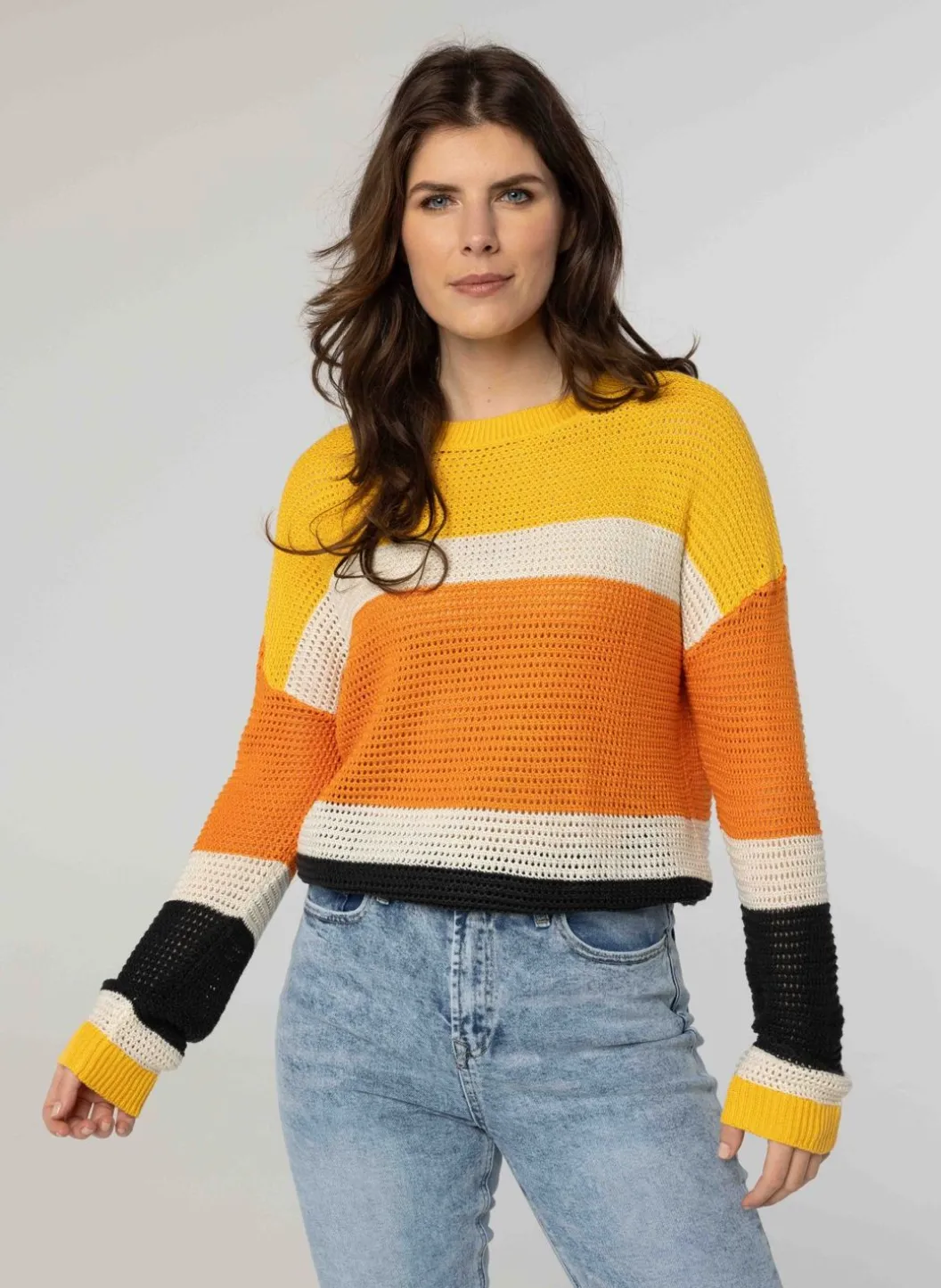 Deze Meerkleurige Open Gebreide Trui Heeft Een Ronde Hals En Lange Mouwen. De Frisse Kleuren Geel, Wit, Oranje En Donkerblauw Zijn Middels Strepen Verwerkt In De Trui.