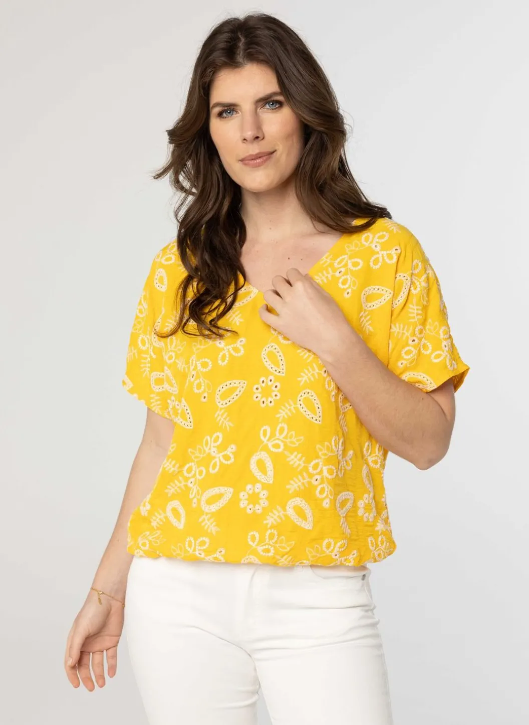 Deze Gele Blouse Met Wit Gestikte Botanische Print Is Deels Opengewerkt. De Blouse Heeft Een Aangeknipte Korte Mouw En Een V-Hals. De Elastieken Band Zorgt Voor Een Bloezend Effect.
