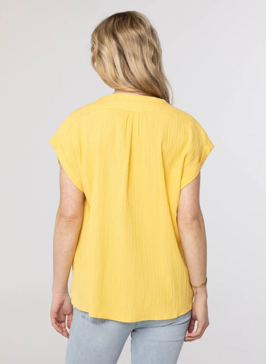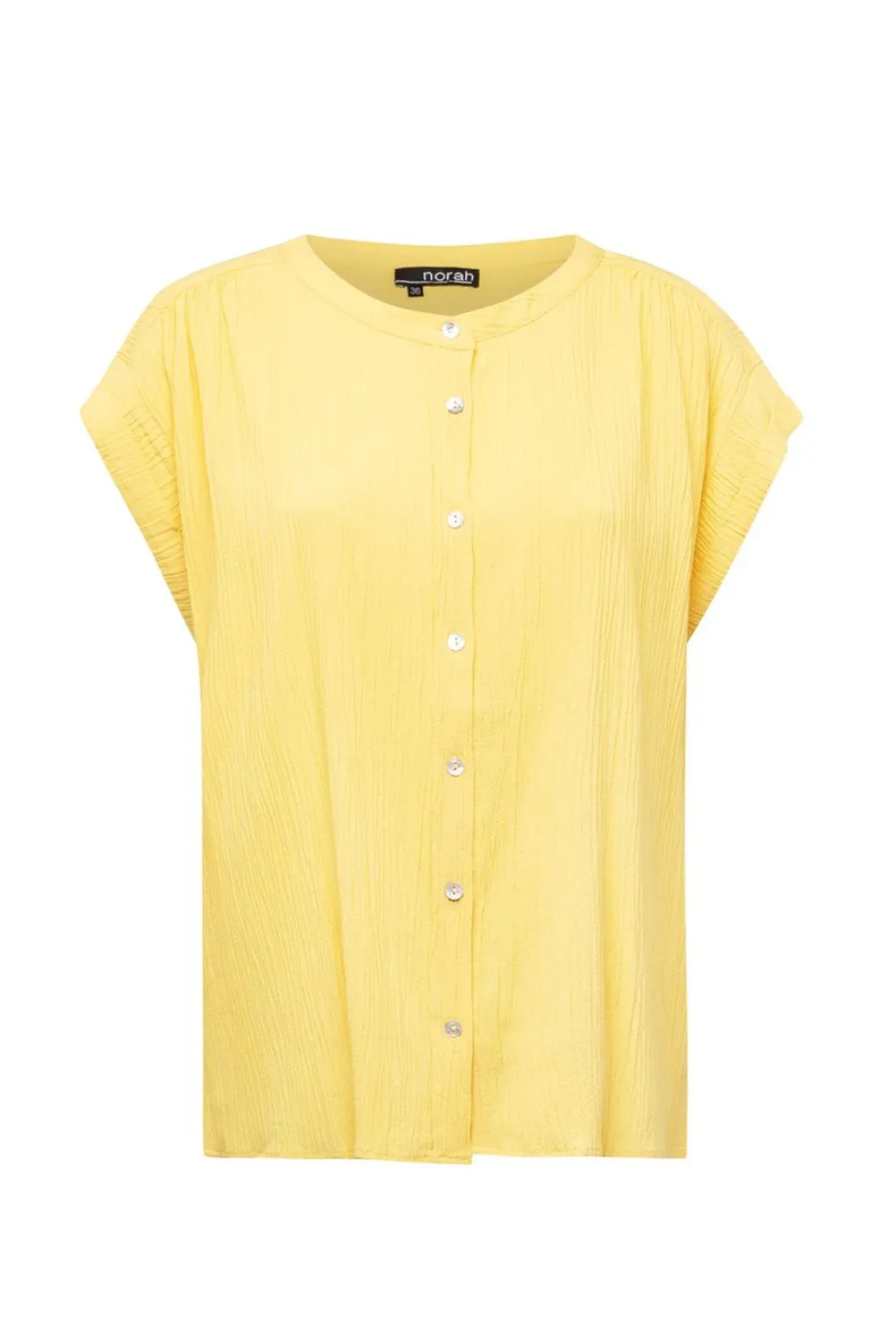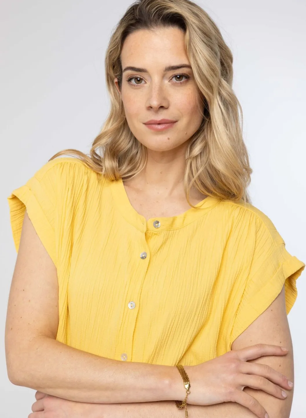 Deze Gele Blouse Met Korte Omgeslagen Mouwen Heeft Een Ronde Halslijn Met Knoopsluiting.