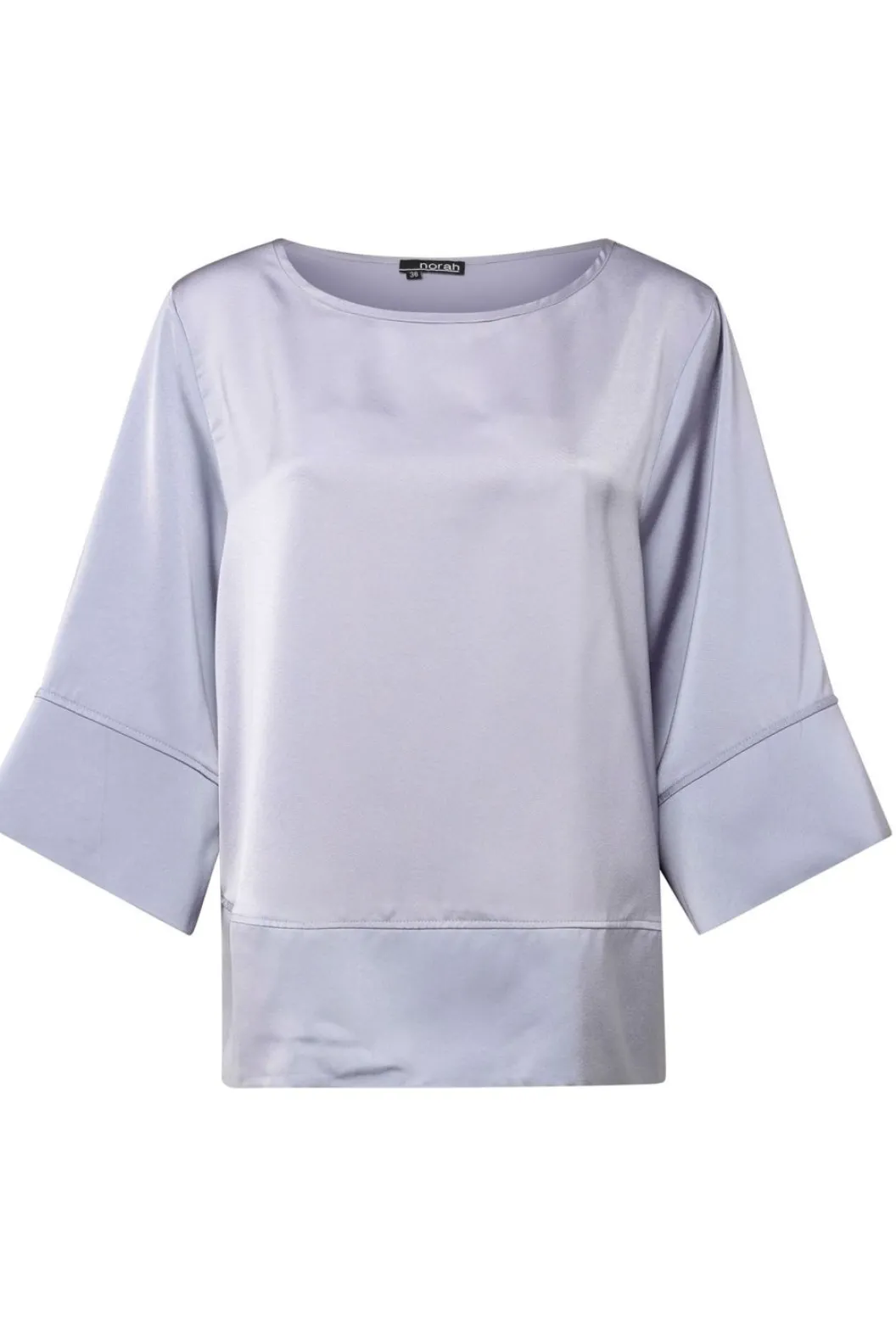Deze Glanzende Blouse Met Wijde Ronde Halslijn En Halflange Wijde Mouwen Heeft Een Grijs/Paarse Kleur. De Blouse Heeft Een Band Van Ongeveer 7 Centimeter Onderaan En Onderaan De Mouwen.