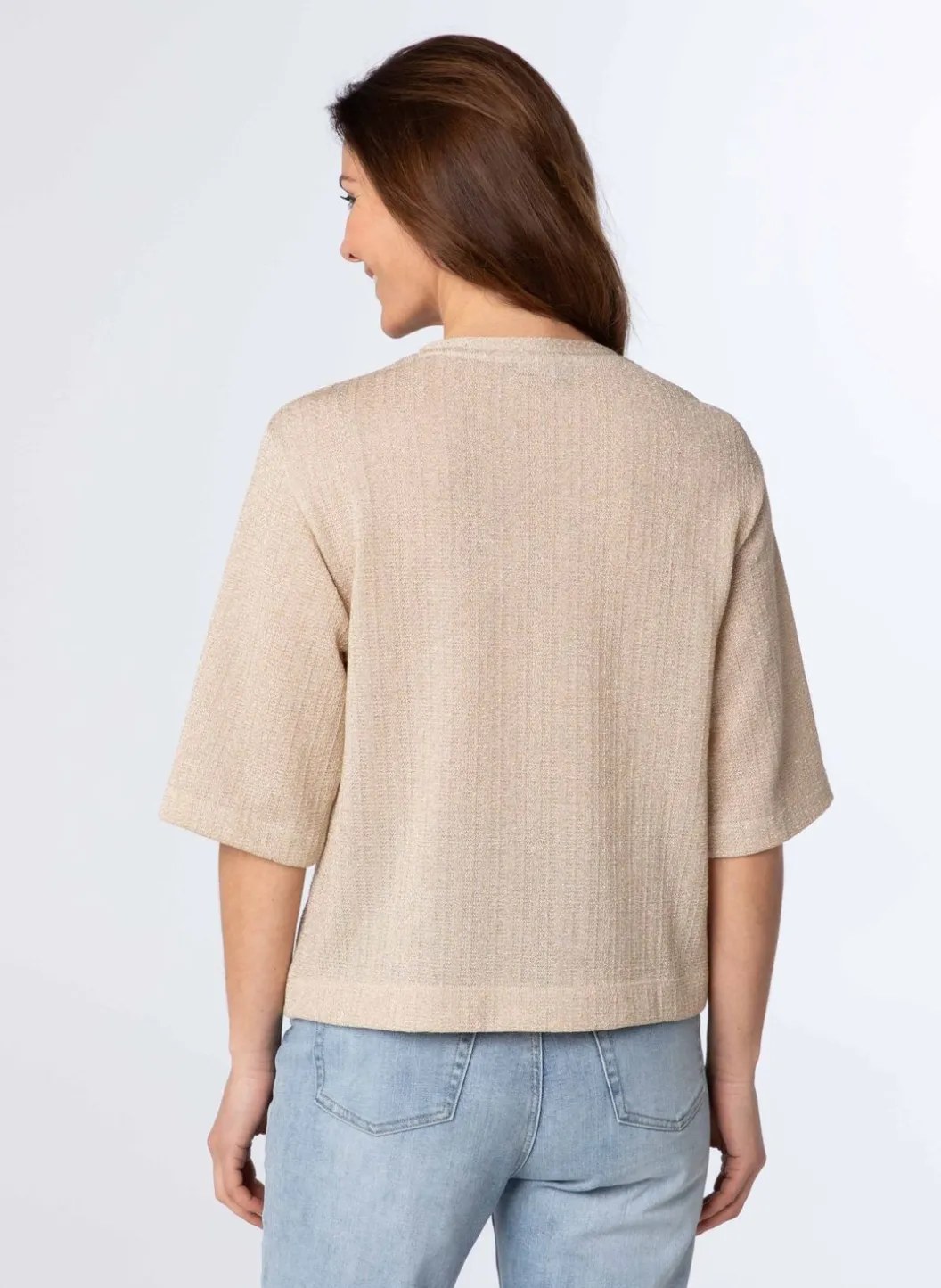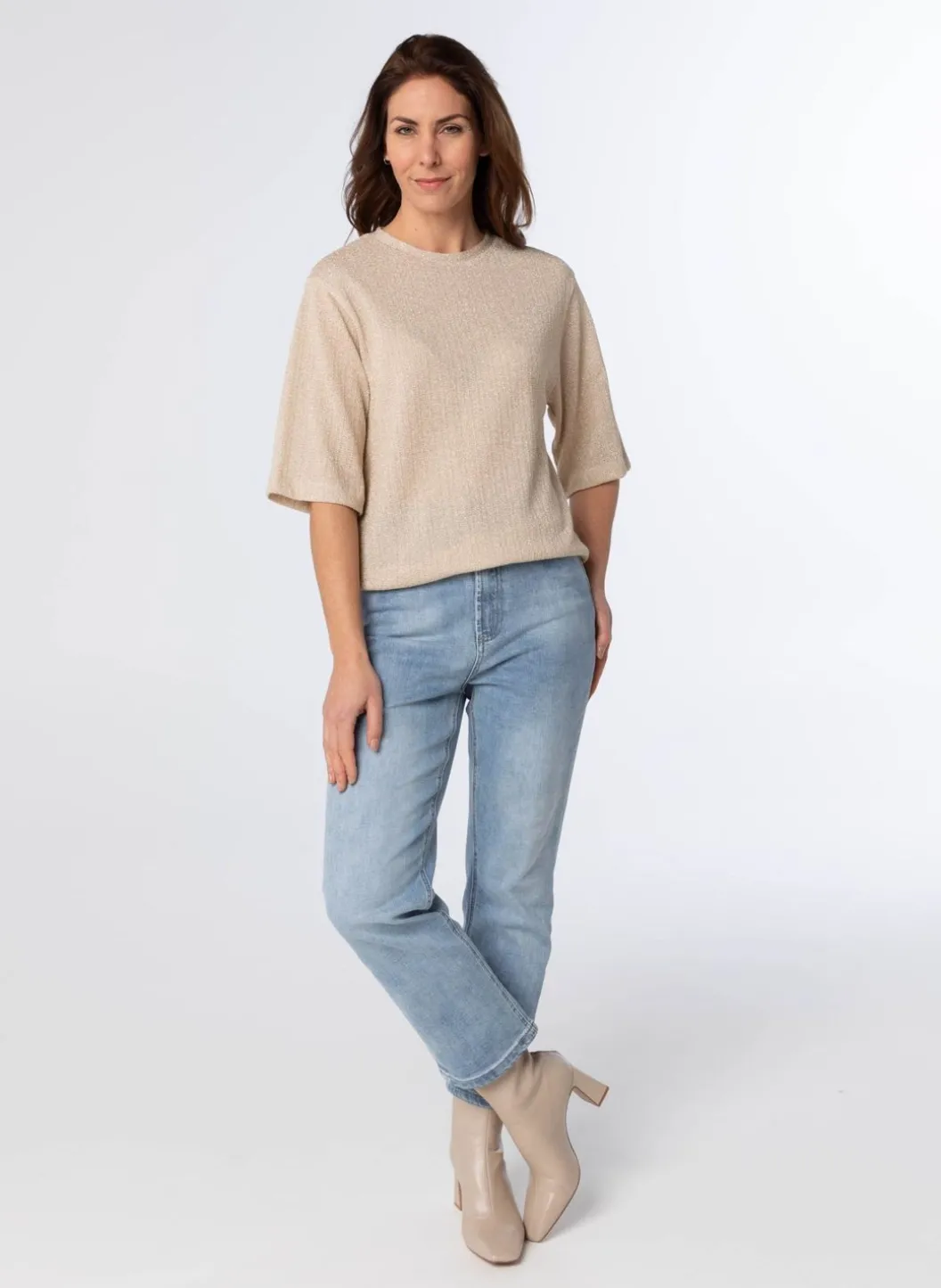 Het Ontwerp Van Deze Trui Is Tijdloos En Elegant. Het Heeft Een Klassieke Ronde Halslijn En Halflange Mouwen Voor Een Veelzijdige Stijl. Wat Deze Trui Echt Bijzonder Maakt, Zijn De Gouden Metallic Draden Die Subtiel In Het Breisel Zijn Verweven. Deze Draden Zorgen Voor Een Prachtig Glinsterend Effect, Waardoor De Trui Een Vleugje Glamour En Allure Krijgt. Een Perfecte Keuze Om Je Outfit Op Te Fleuren En Een Beetje Extra Sprankeling Toe Te Voegen Aan Je Dagelijkse Look.