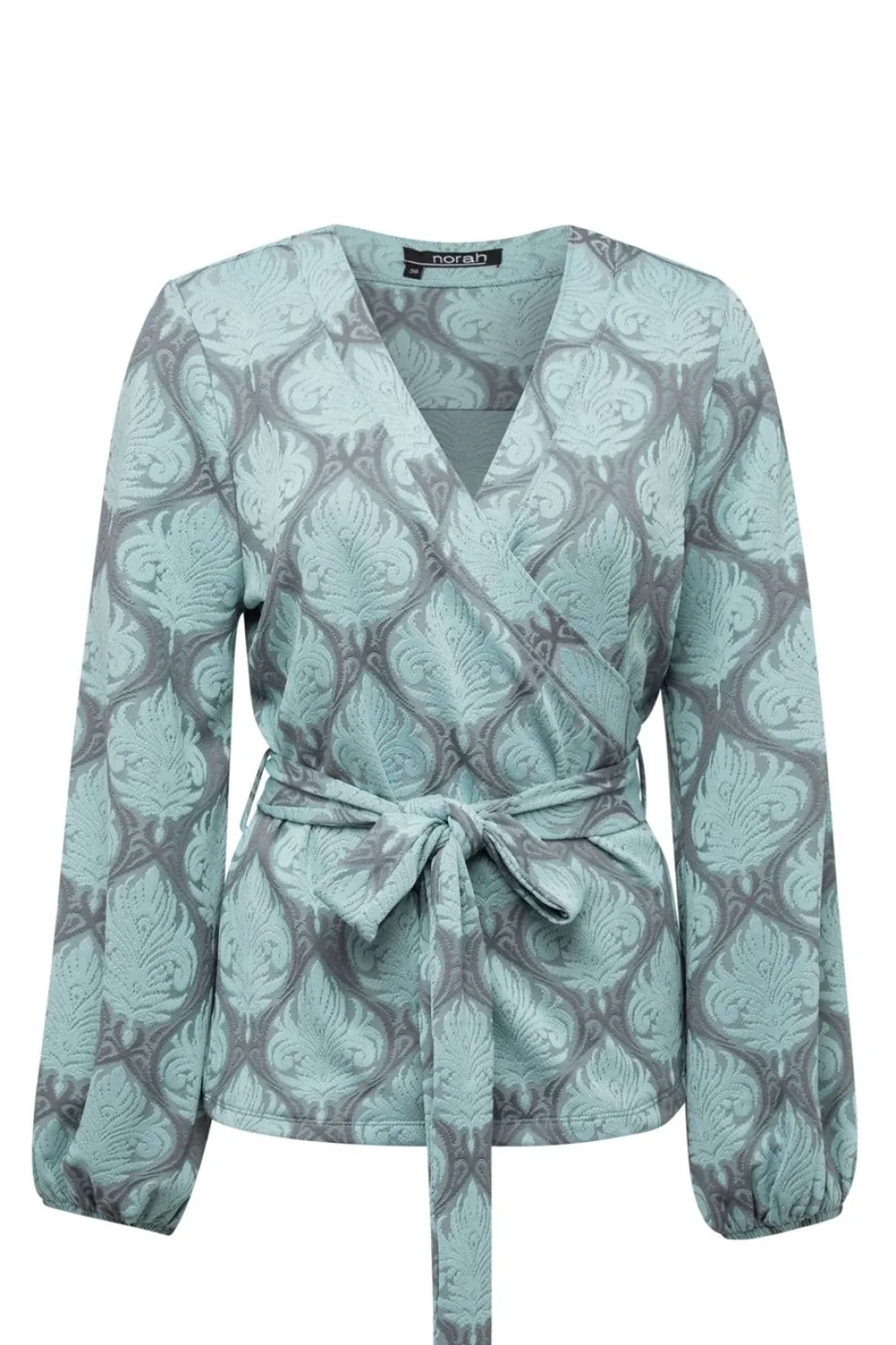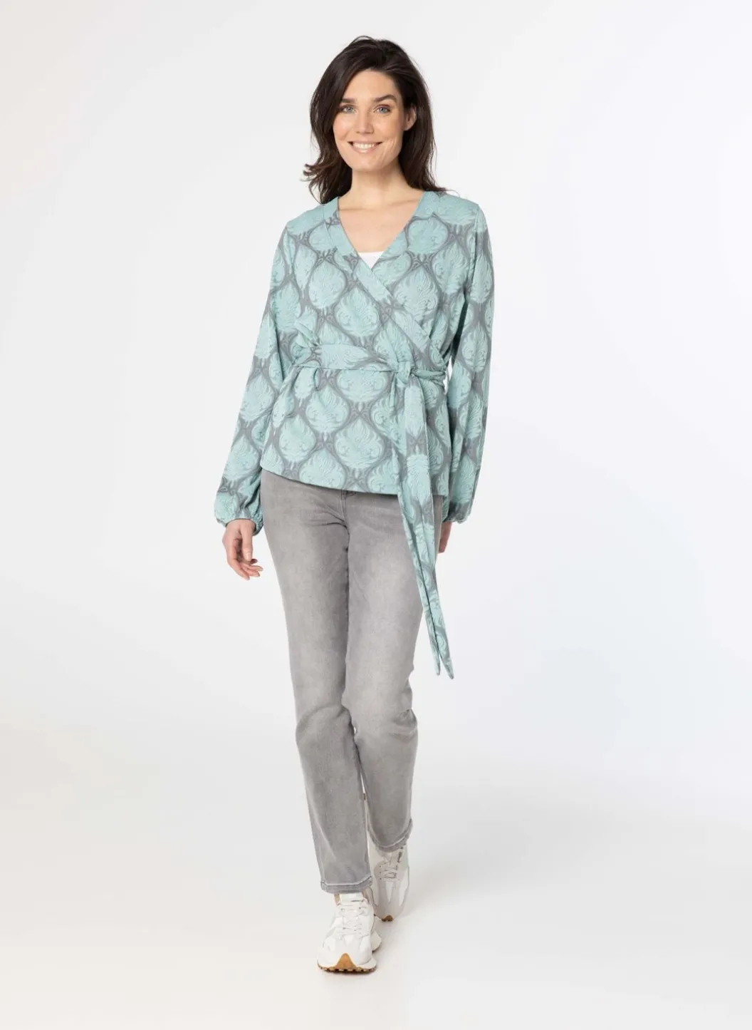 Een Vaste Overslag Trui Met Botanische Print In De Kleuren Grijs En Groen. De Overslag Trui Heeft Lange Ballonmouwen, Een Diepe V-Hals En Een Ceintuur.