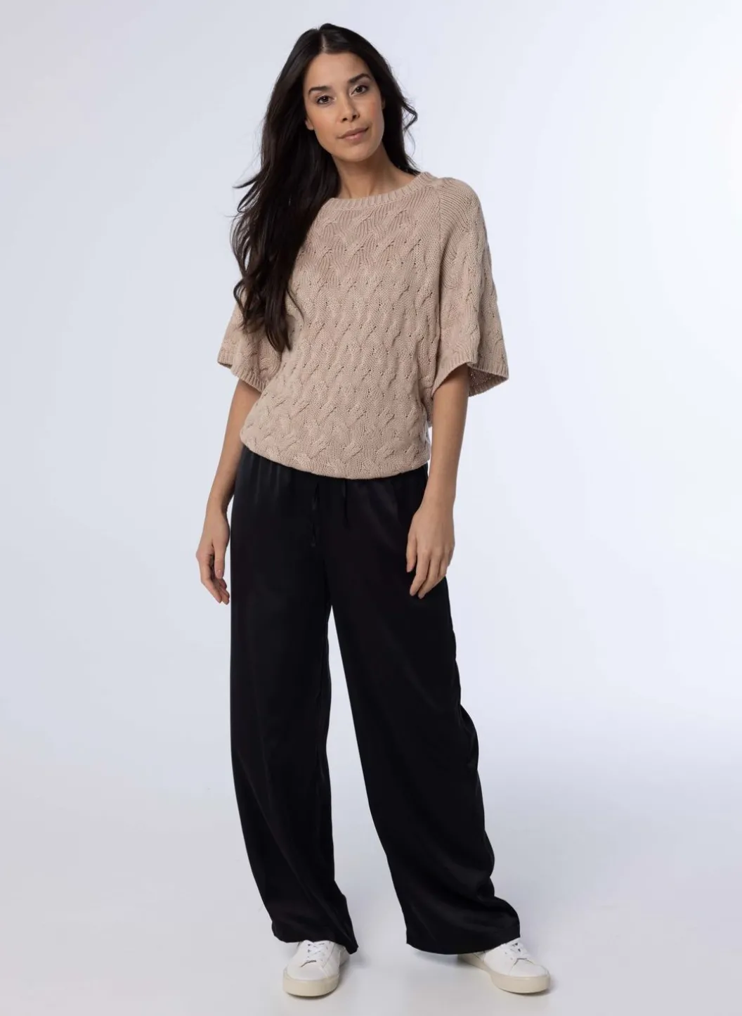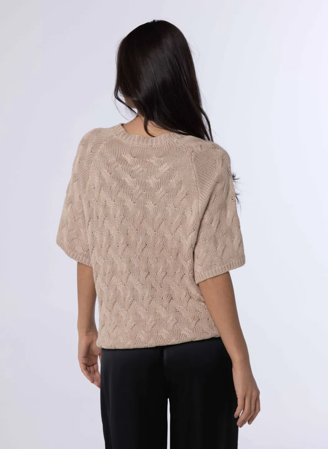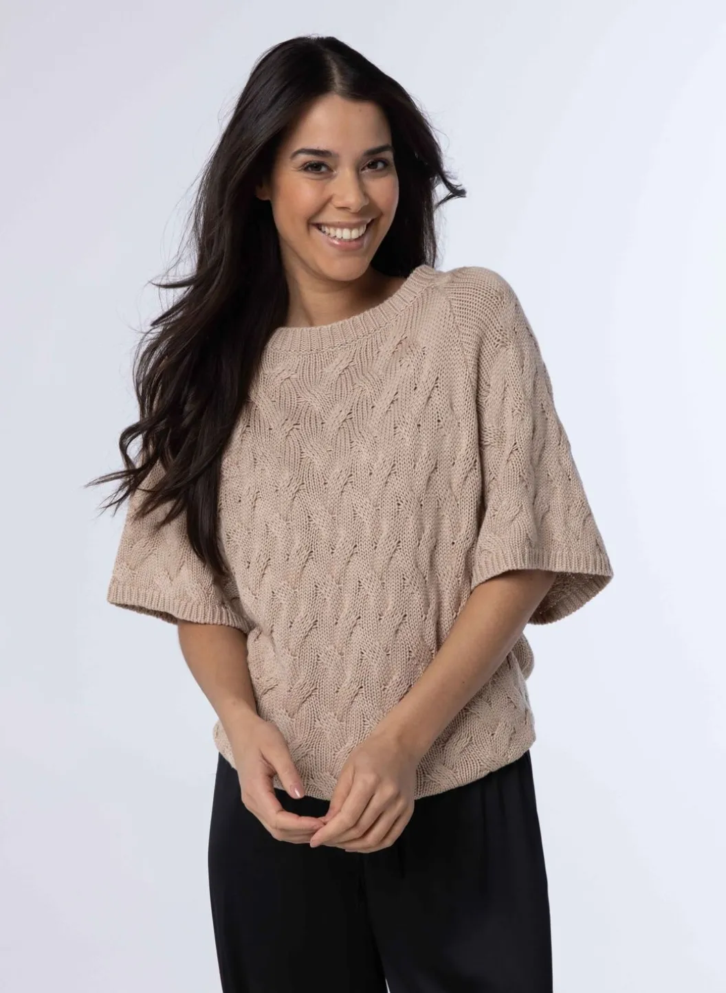 De Grof Gebreide Trui Heeft Een Klassieke Ronde Halslijn, Halflange Mouwen Afgewerkt Met Een Smalle Boord, En Is Met Uiterste Precisie Gebreid In Een Prachtig Vlechtpatroon. Deze Tijdloze Trui Is Gemaakt Van Hoogwaardige Wol En Biedt Zowel Comfort Als Stijl. Een Perfecte Aanvulling Op Elke Garderobe, Of Het Nu Voor Een Casual Dagje Uit Of Een Gezellige Avond Met Vrienden Is.