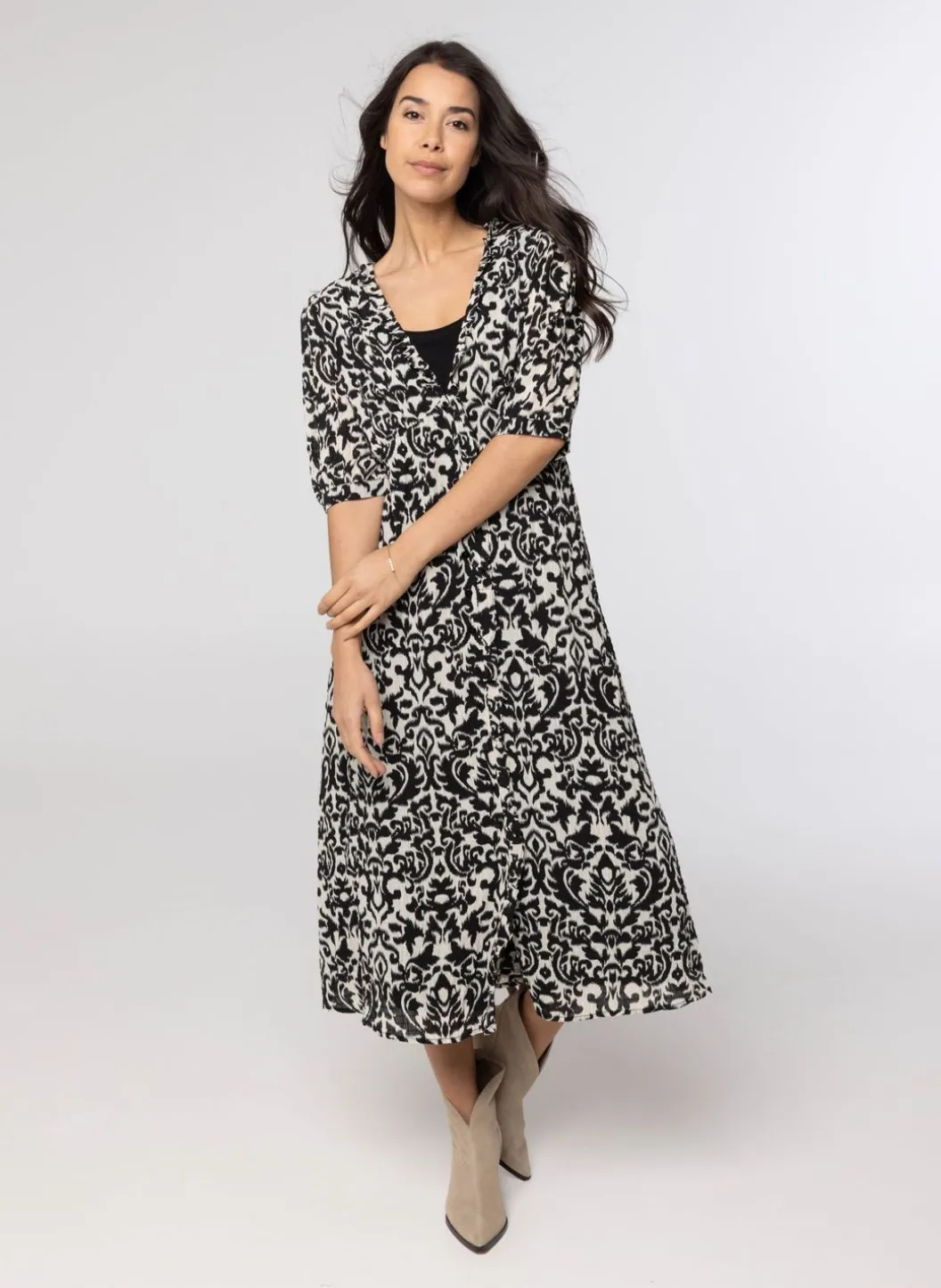 Deze Jurk Met V-Hals Met Ruches Loopt Door In Een Knoopsluiting Tot 20 Centimeter Van Onder. De Jurk Heeft Halflange Mouwen Met Een Knoopsluiting. De Jurk Valt Ruim, Wij Adviseren Om Een Tot Twee Maten Kleiner Te Kopen. De Jurk Heeft Een Vastgestikte Onderjurk. In Dezelfde Print Hebben We Een Tuniek.