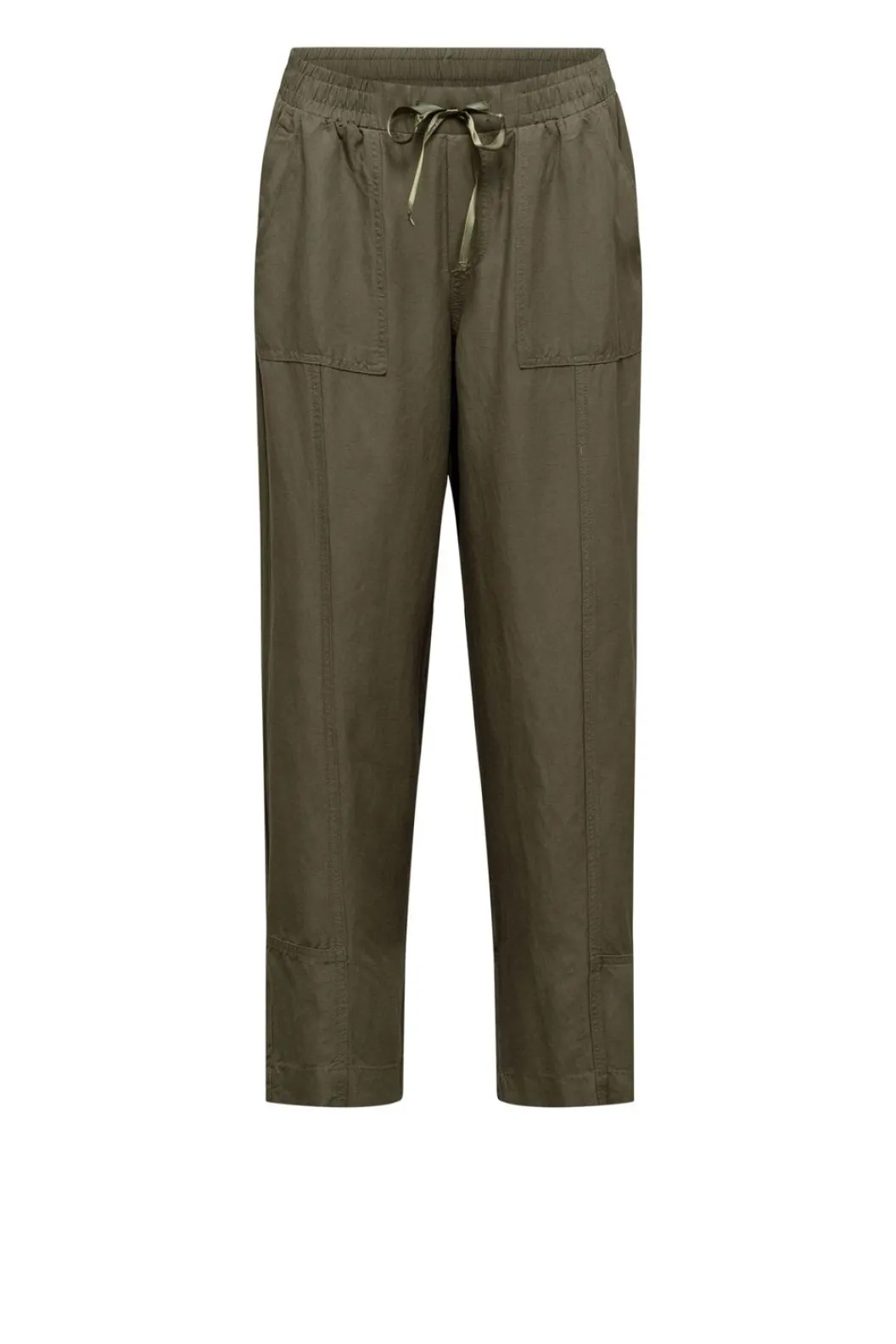 Deze Los Vallende Legergroene Broek Met Linnen Look Heeft Een Elastieken Band In De Taille Met Een Trekkoord. De Broek Heeft Grove Steekzakken En Twee Zakken Op De Achterzijde. De Broek Heeft Een Rechte Pijp.