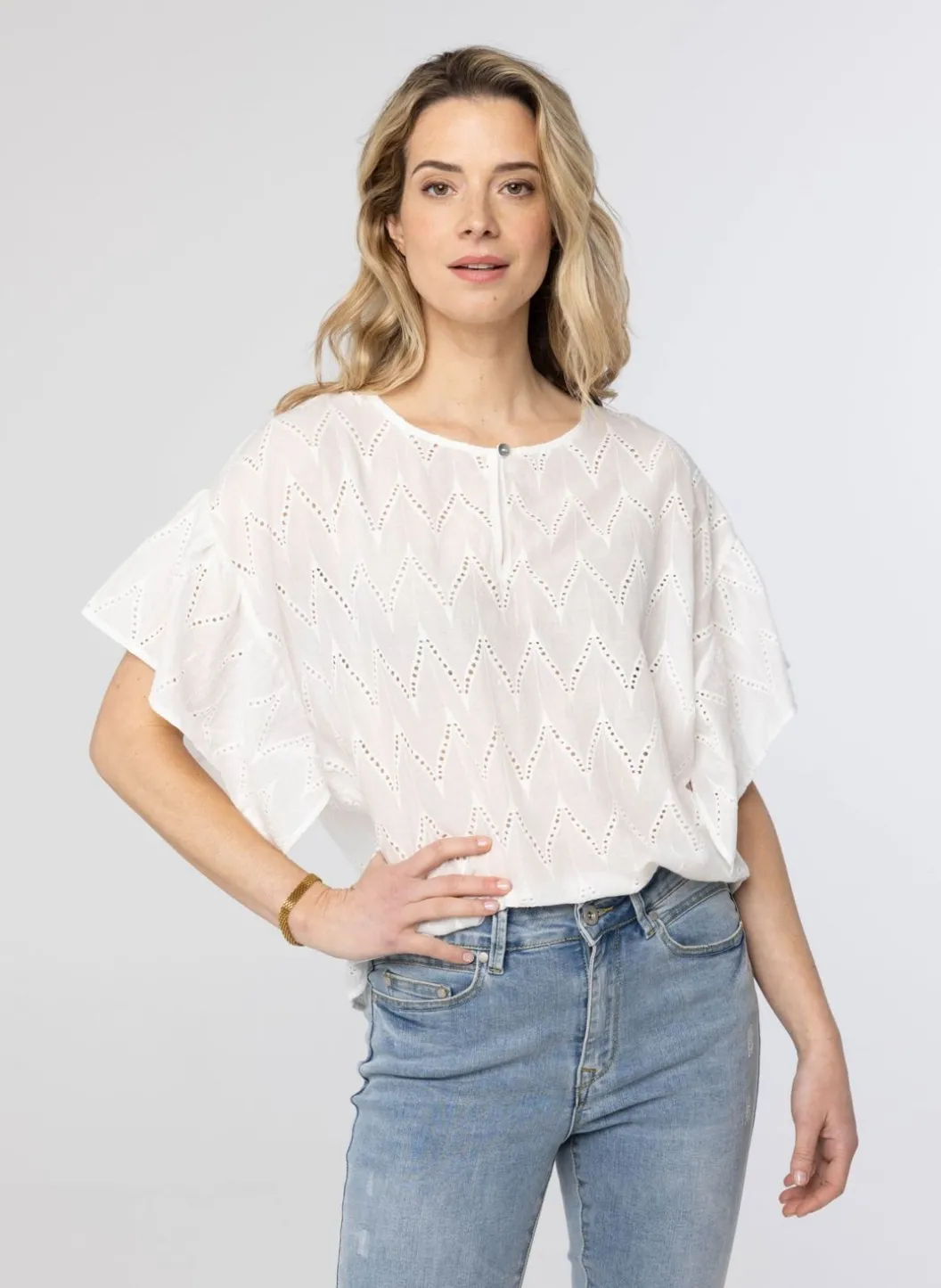 Deze Off White Blouse Met Sierlijke Mouwen En Opengewerkte Embroidery Heeft Een Knoopsluiting Aan Voorzijde. De Achterzijde Van De Blouse Is Langer Dan De Voorzijde.