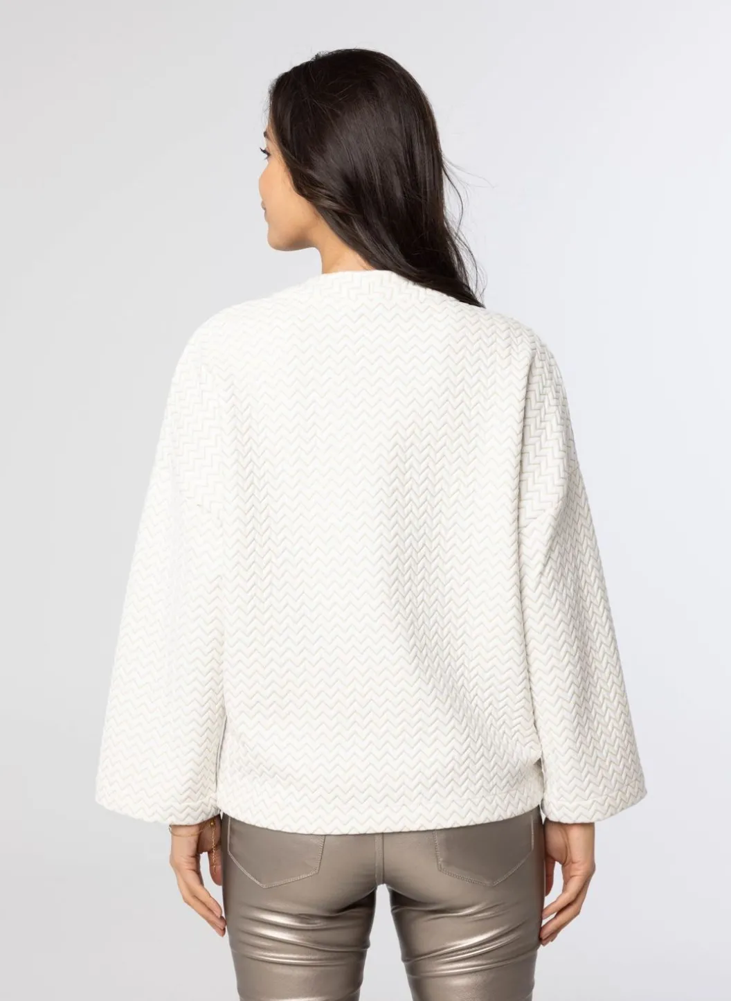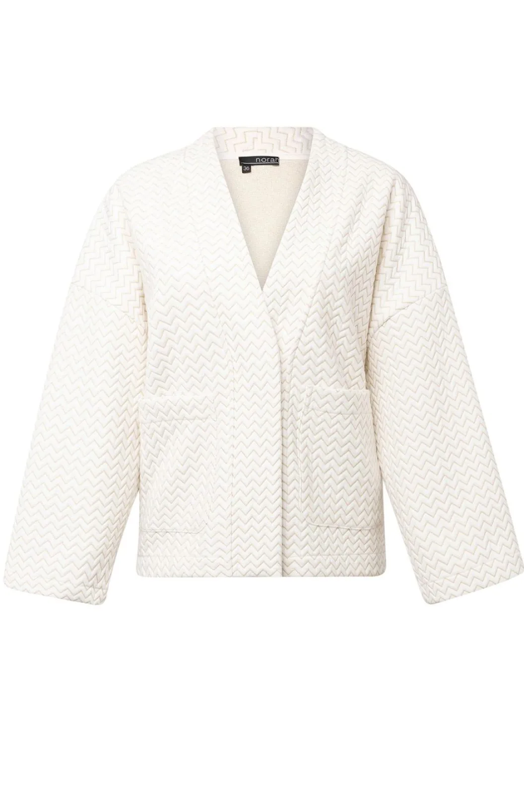 Off White Kimono Jasje Met Gouden Zigzag Draad. De Jacket Valt Oversized, Heeft Lange Mouwen, Twee Zakken Aan De Voorkant En Sluit Met Drukknopen.
