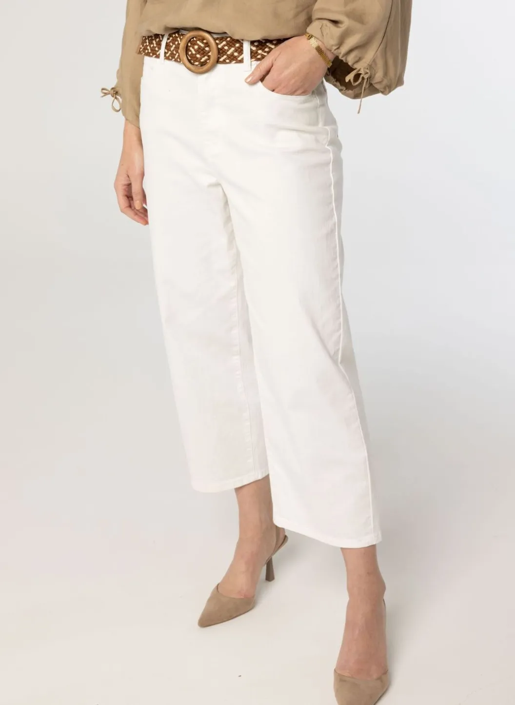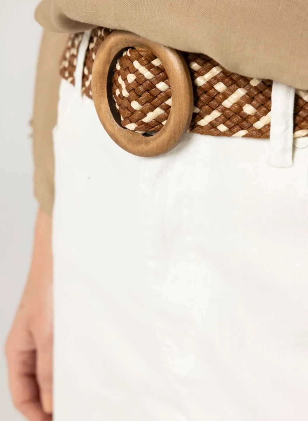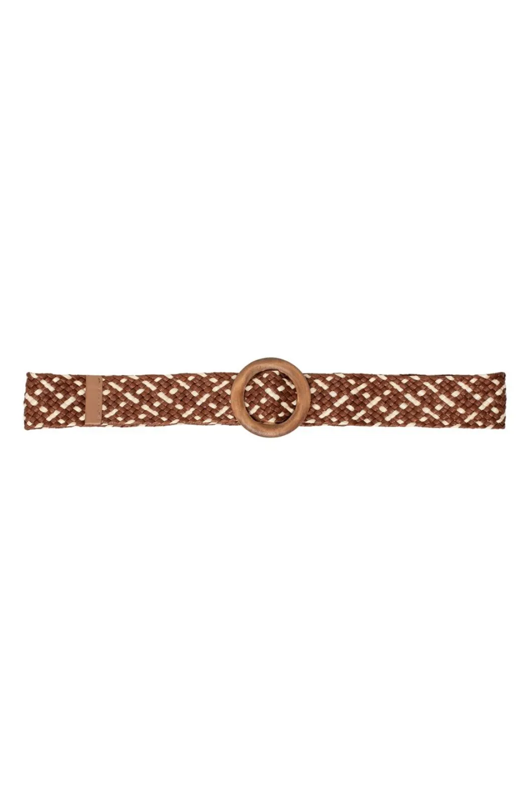 Deze Gevlochten Riem Van Bruin En Ecru Wordt Gesloten Met Een Ronde Houten Gesp.
