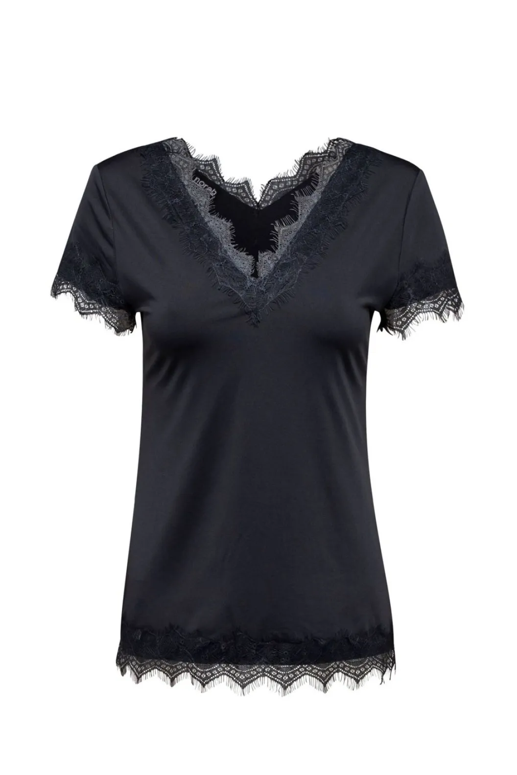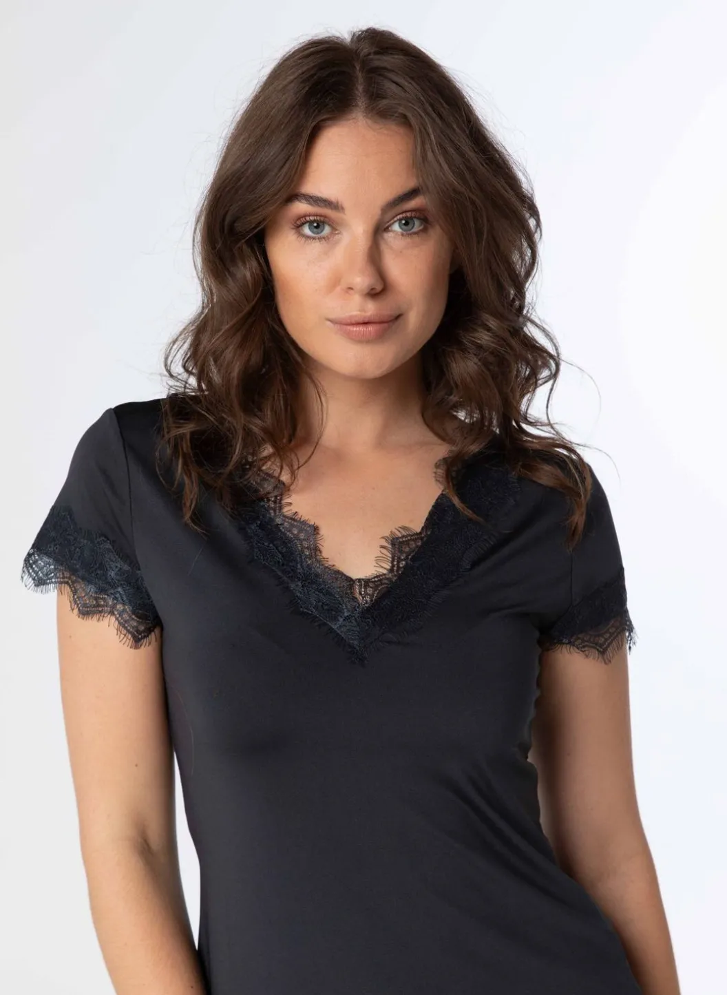Een Shirt Met Veel Stretch, Korte Mouwen En Een V-Hals. Dit Veelzijdige Shirt Is Versierd Met Delicate Kanten Details Langs De Halslijn, Mouwen En Zoom, Wat Een Elegante Touch Toevoegt Aan Het Ontwerp. Perfect Voor Zowel Casual Als Feestelijke Gelegenheden, Dit Shirt Is Een Essentieel Item In De Garderobe Dat Stijl En Comfort Moeiteloos Combineert.