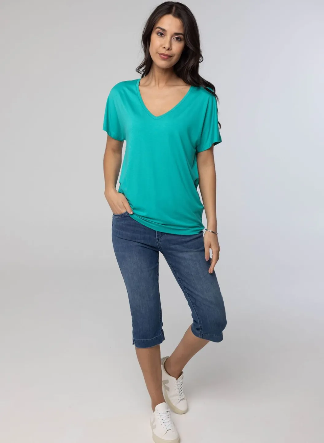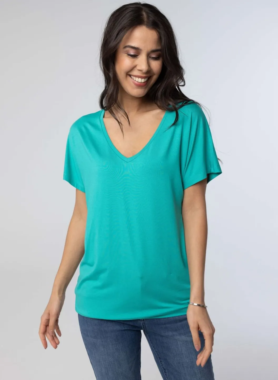 Shirt Met Stretch, Een V-Hals En Korte, Aangeknipte Mouwen.