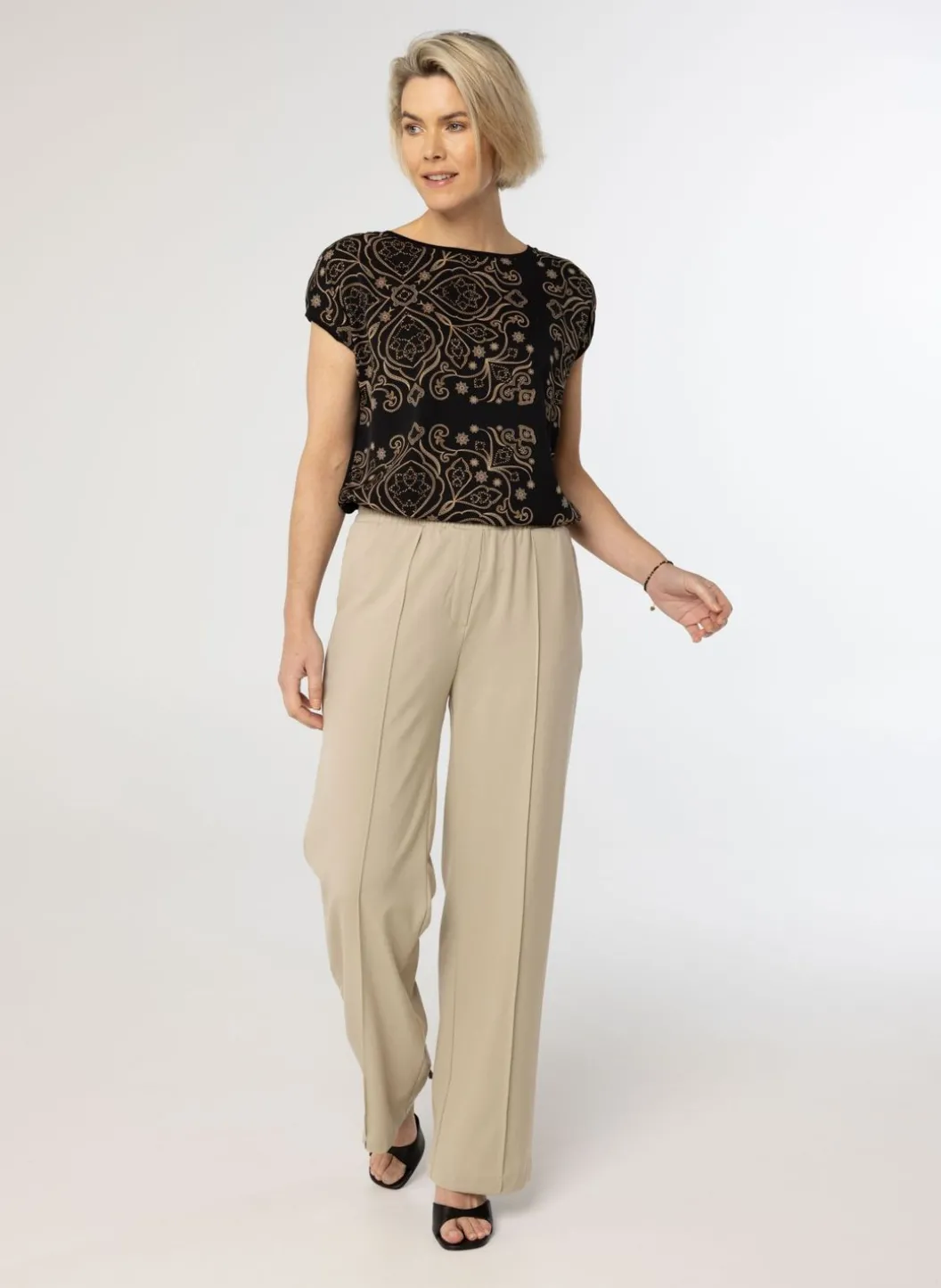 Dit Zwarte Shirt Heeft Aan De Voorzijde Een Gouden Grafische Print En Is Aan De Achterzijde Volledig Zwart. Het Shirt Heeft Aangeknipte Korte Mouwen En Een Ronde Halslijn. Het Shirt Is Onderdeel Van Een Co-Ord Set.&Nbsp;De Bijpassende Rok Vind Je Hier.