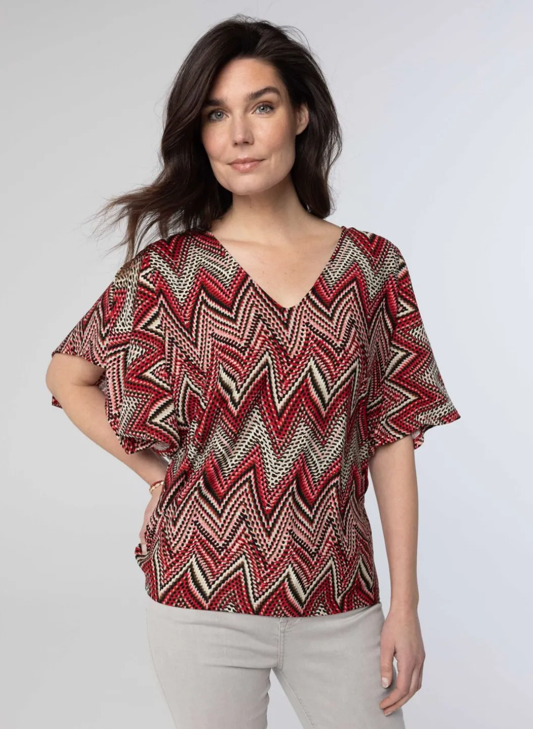 Dit Shirt Met V-Hals, Sierlijke Vlindermouwen Heeft Veel Stretch. De Grafische Print Bestaat Uit De Kleuren Rood, Roze, Zwart, Bruin, Ecru En Grijs. Dit Shirt Is Onderdeel Van Een Co-Ord Set. Maak De Set Compleet Met De Broek In Dezelfde Print.