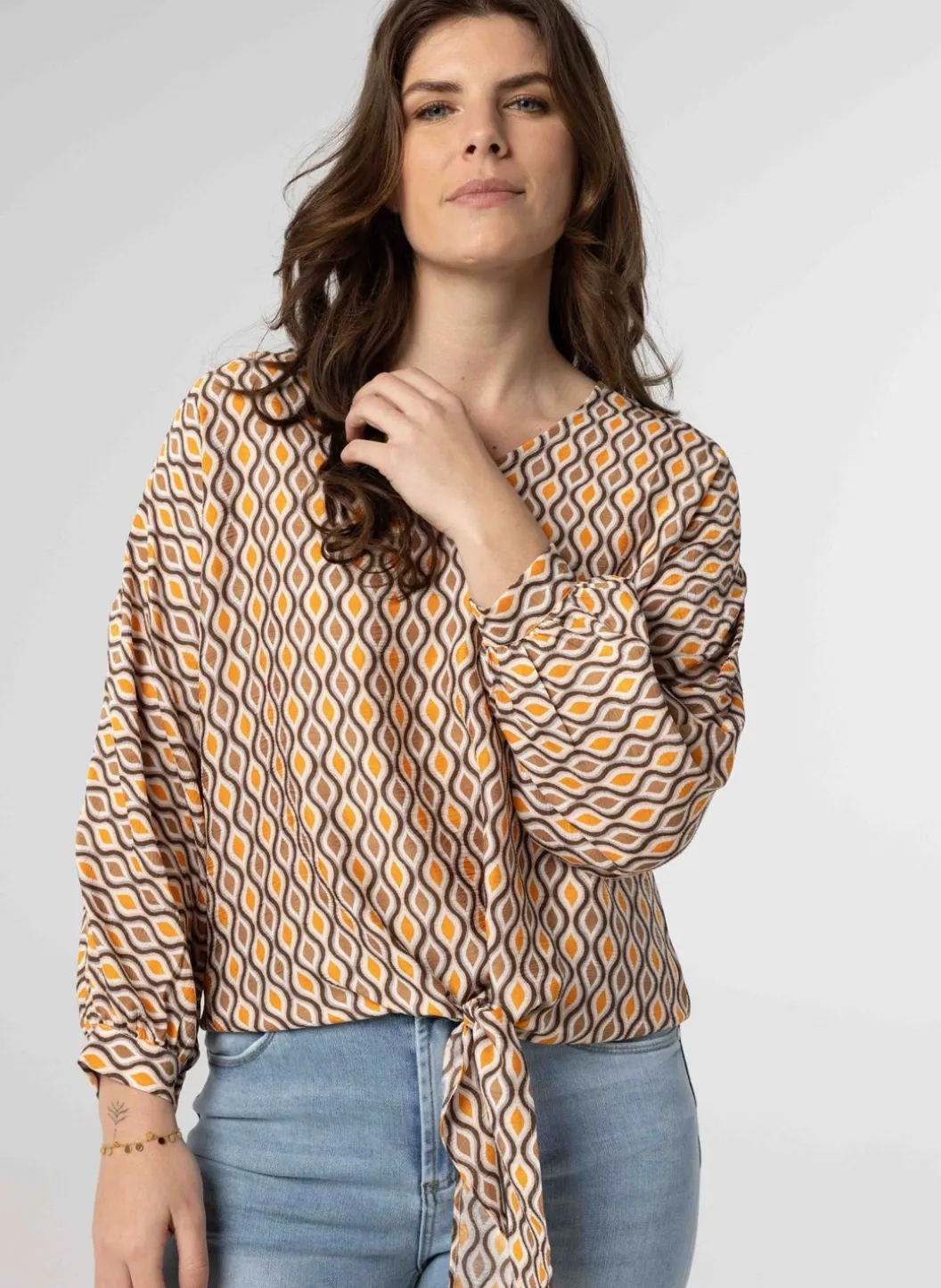 Dit Shirt Met V-Hals En Luchtige Stof Heeft Een Strikdetail Onderaan Het Shirt. De Verwerkte Kleuren: Bruin, Oranje, Lichtrijs, Wit En Beige. De Wijde Lange Mouwen Hebben Een Manchet Met Knoop. In Dezelfde Kleur En Met Hetzelfde Patroon Hebben We Een Shirt.