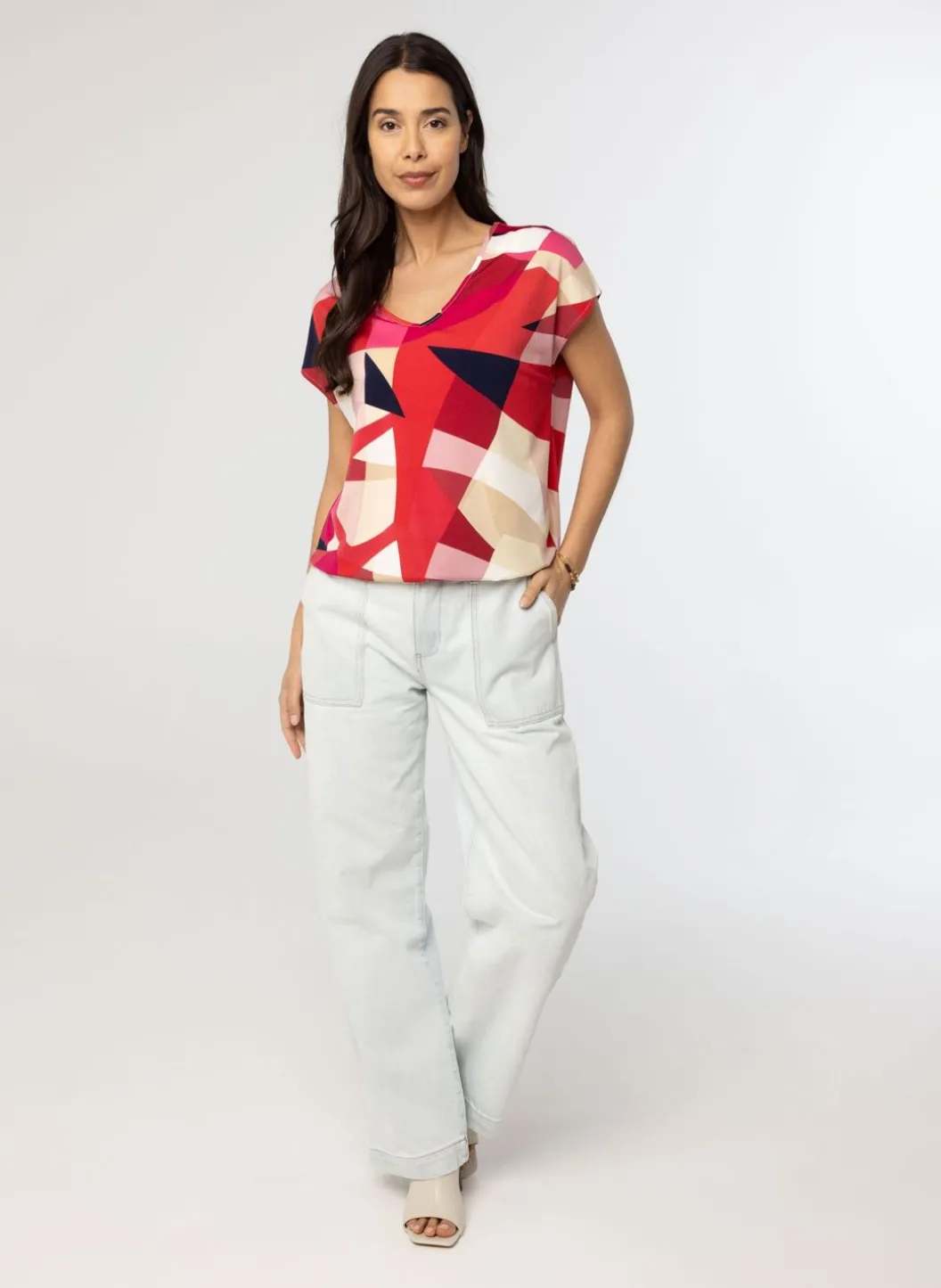 Dit Meerkleurige Shirt Heeft Korte Aangeknipte Mouwen, Een Elastieken Band Onderaan En Een V-Hals. Het Shirt Bestaat Uit De Kleuren Ecru, Paars, Bordeaux, Fuchsia, Roze En Rood. Dol Op Deze Print? We Hebben Ook Een Rok, Blouse, Een Blouse Met Knoopsluiting En Tas In Deze Kleuren En Met Dezelfde Print.