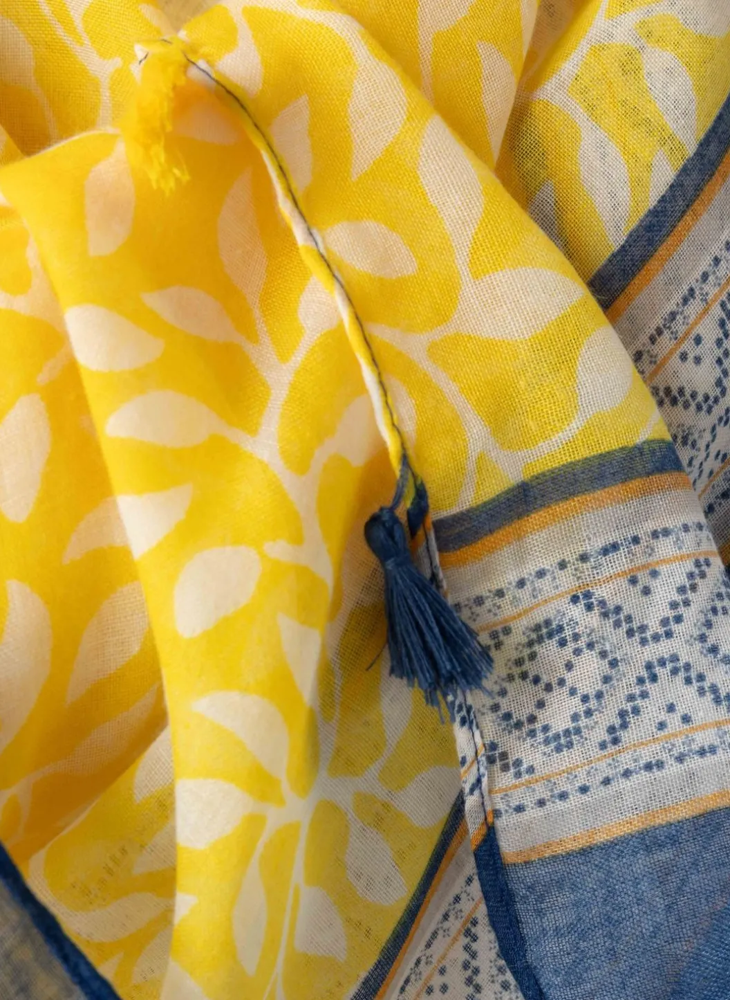 Dunne Geweven Sjaal Met Geel En Blauwe Tinten En Tassels.