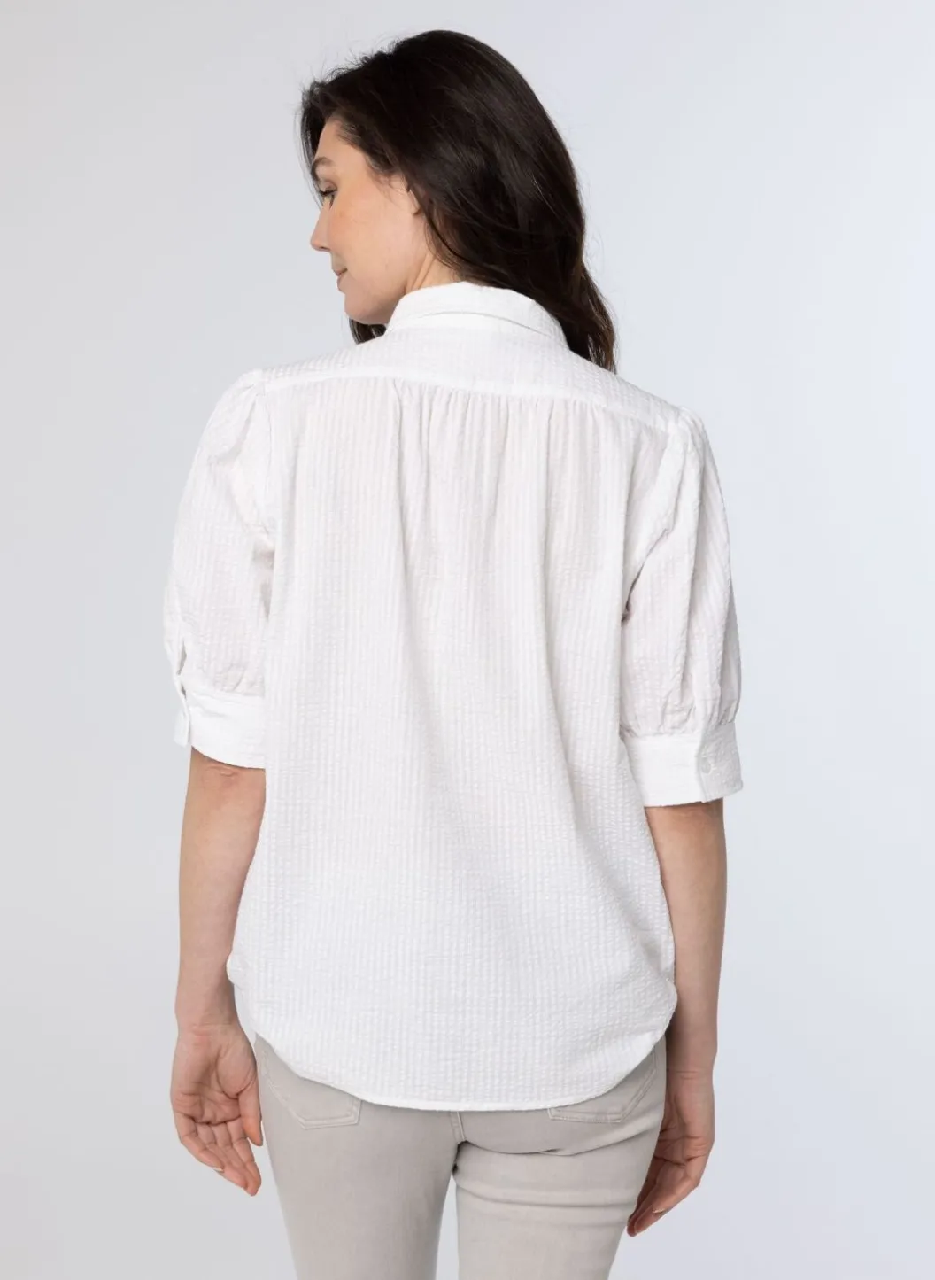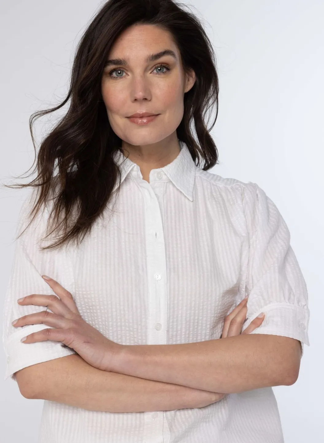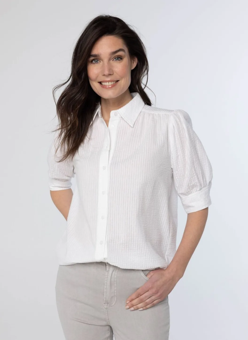 Deze Witte Blouse Van Wafelstof Heeft Een Klassieke Kraag Met Knoopsluiting, Halflange Mouwen Met Een Splitmanchet En Knoop En Geplooide Details Op De Schouder En Rug. De Blouse Is Licht Doorschijnend.