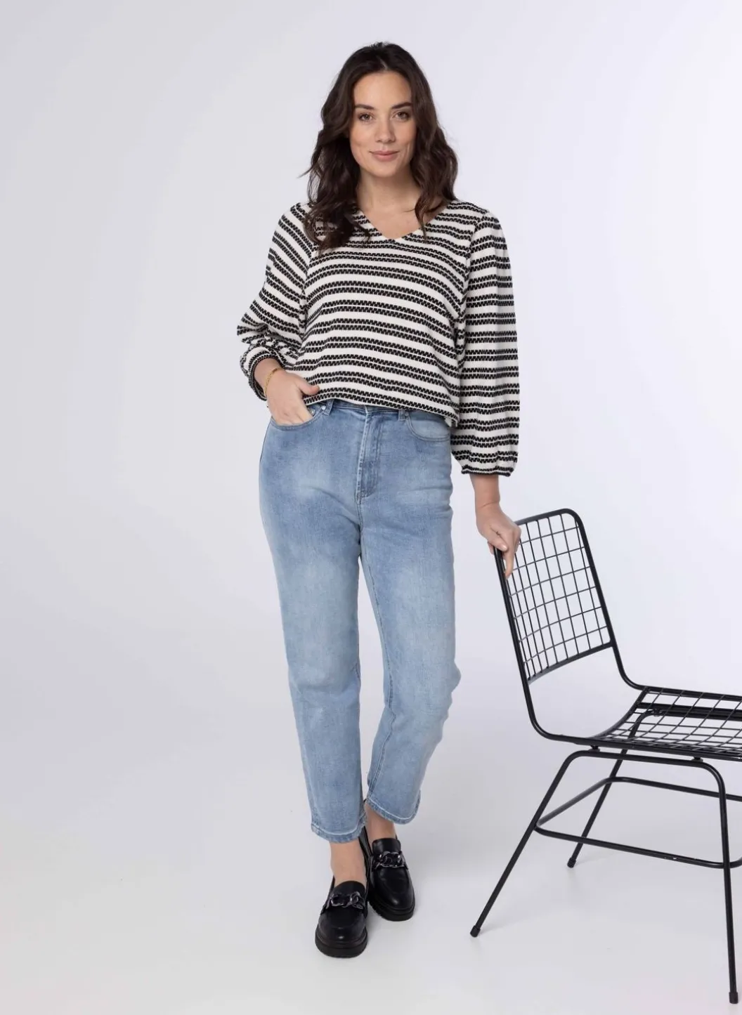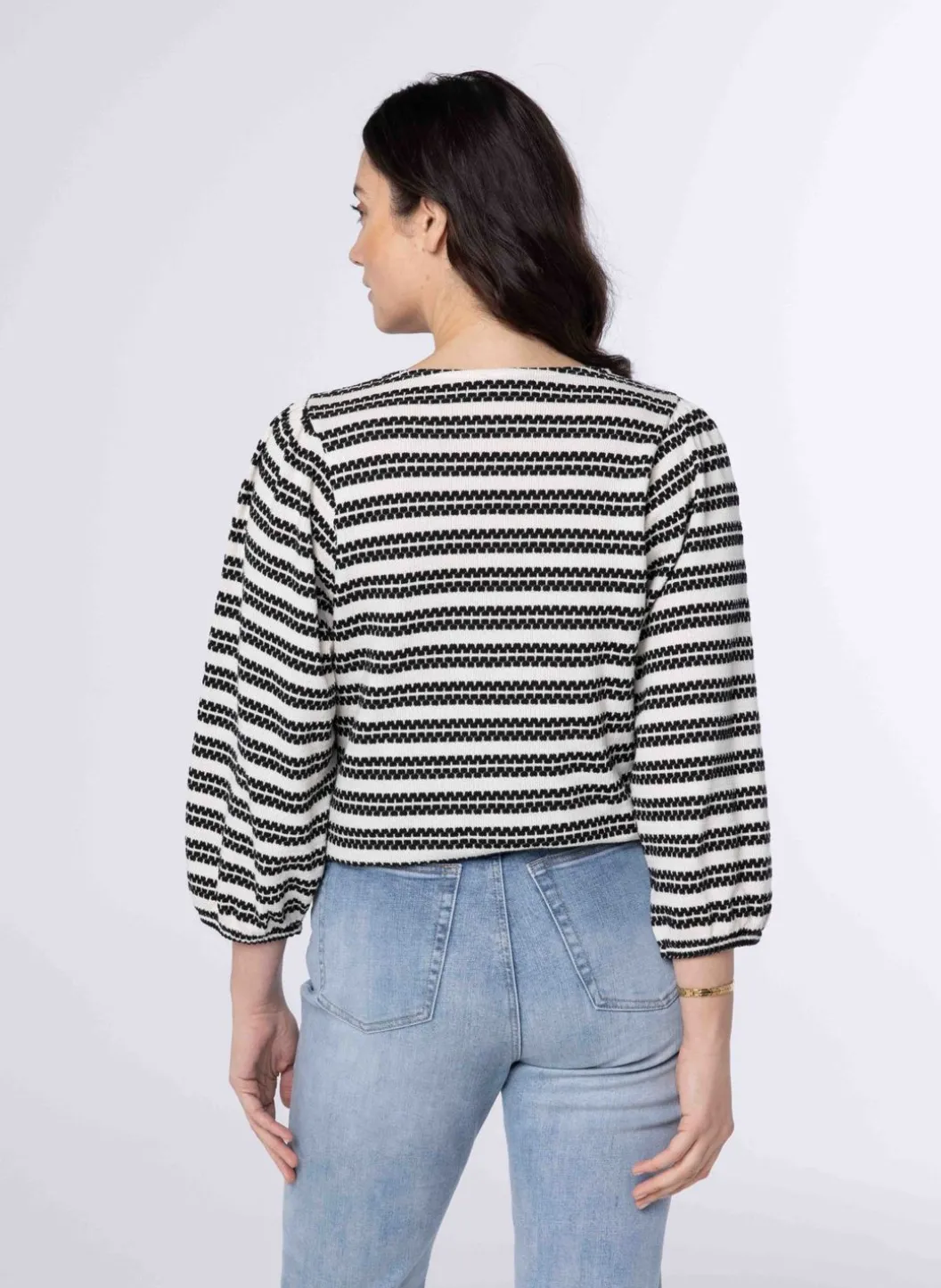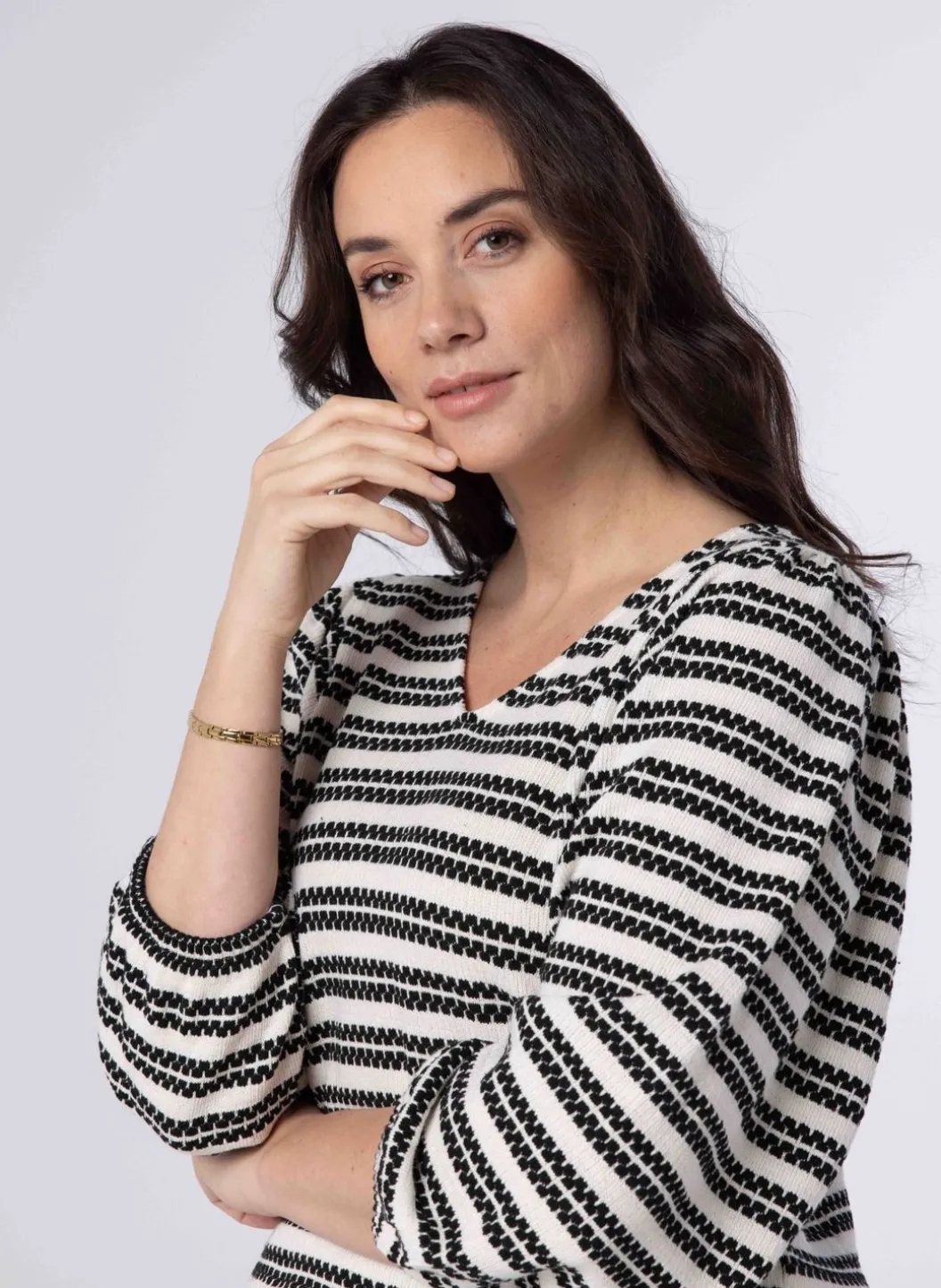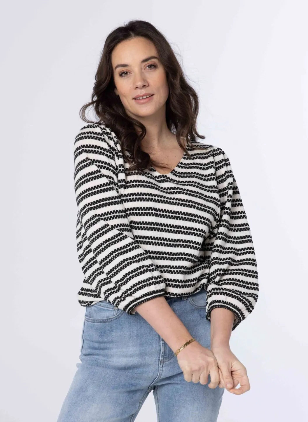 Een Los Vallende Trui Gemaakt Van Een Katoenmix, Met Een Ronde Halslijn, Lange Pofmouwen En Een Stijlvol Streepjespatroon. Deze Veelzijdige En Comfortabele Trui Is Perfect Voor Zowel Casual Als Feestelijke Gelegenheden. Blijf Gezellig En Modieus Met Deze Onmisbare Garderobe Must-Have!