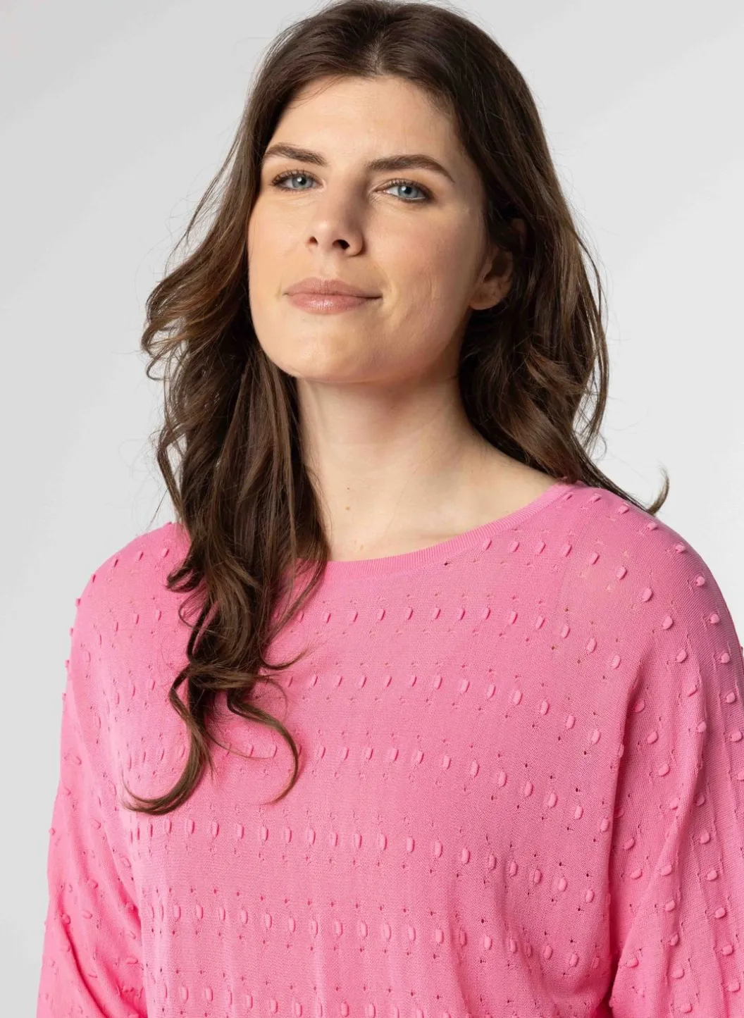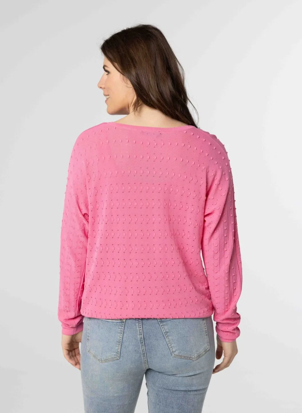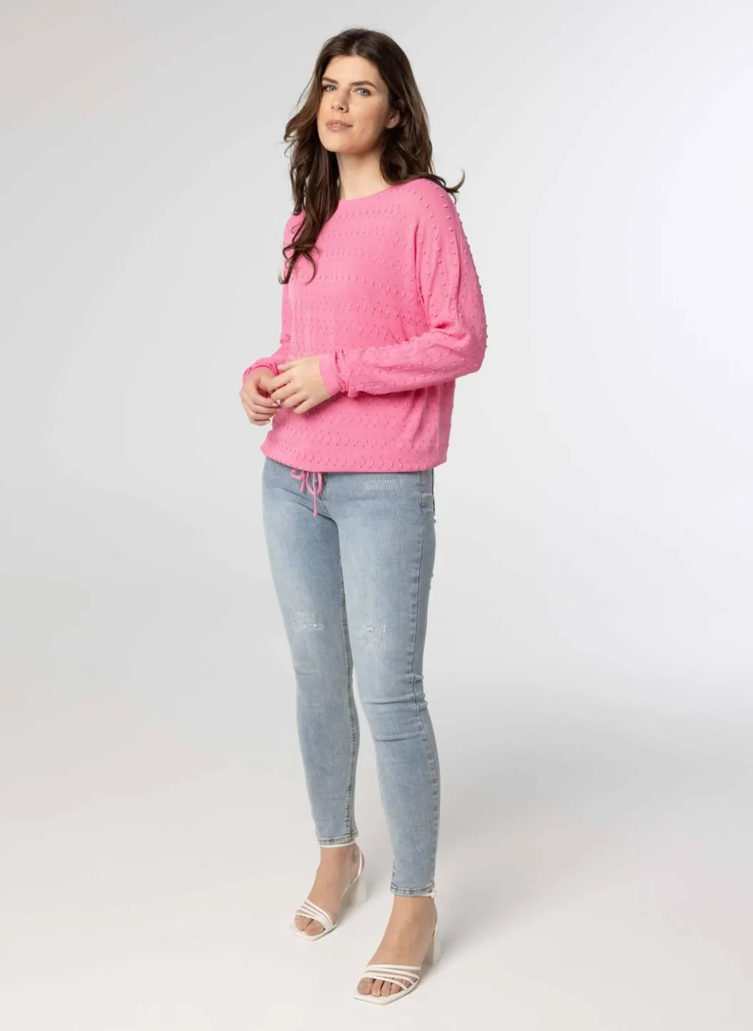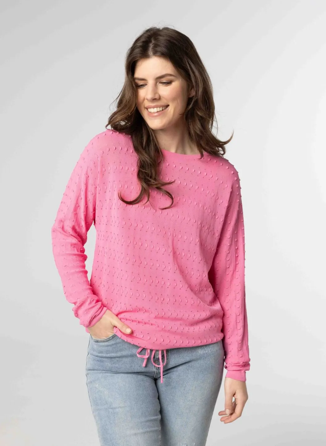 Een Roze Trui Met Een Ronde Halslijn En Lange Mouwen Met Een Smalle Boord. De Trui Is Voorzien Van Opengewerkte Borduursels. De Onderkant Van De Blouse Is Afgewerkt Met Een Drawstring, Wat Een Blousend Effect Geeft.