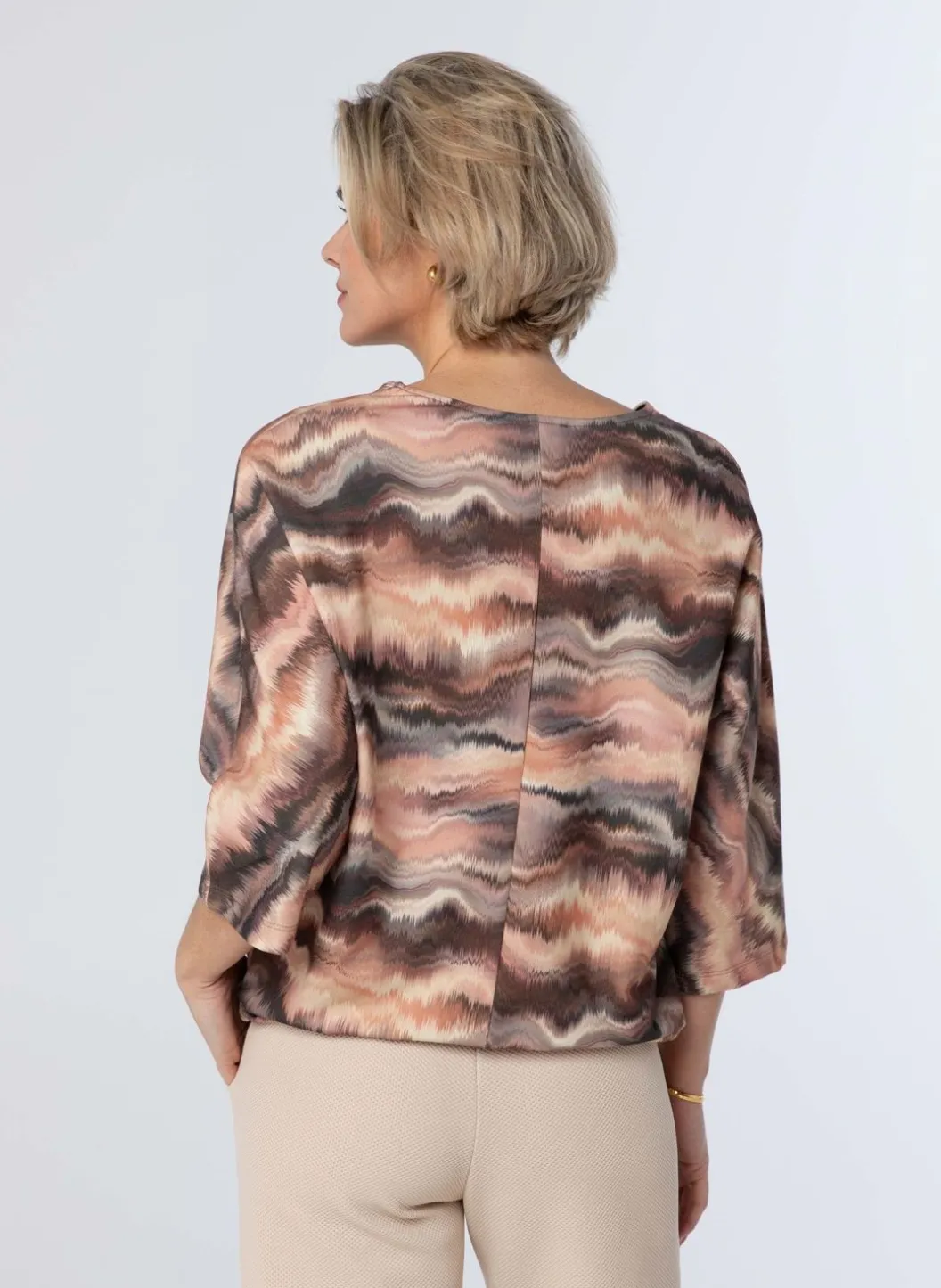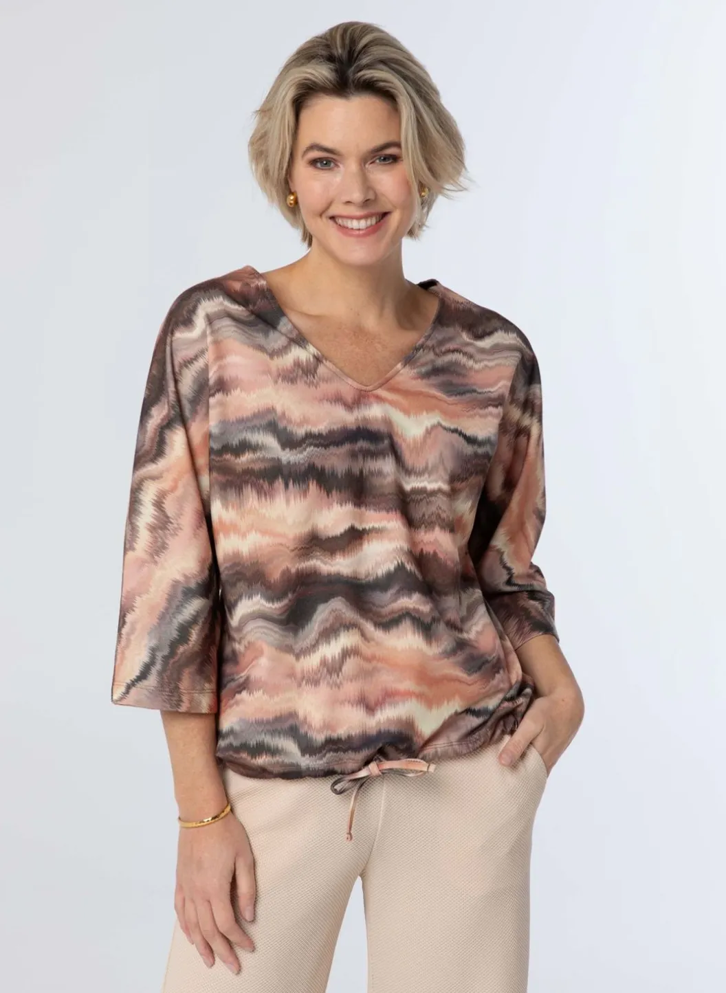 Ervaar Het Comfort En De Stijl Van Deze Heerlijke Trui. Gemaakt Van Zacht Materiaal Met Een Vleugje Stretch, Biedt Het Een Perfecte Pasvorm. De Prachtige Grafische Print Voegt Een Vleugje Elegantie Toe, Terwijl De V-Hals En Driekwart Mouwen Zorgen Voor Een Chique Uitstraling. De Trui Is Afgewerkt Met Een Trekkoorddetail Aan De Onderkant, Wat Een Unieke En Trendy Touch Aan Je Outfit Geeft. Blijf Gezellig En Modieus Met Dit Geweldige Stuk.