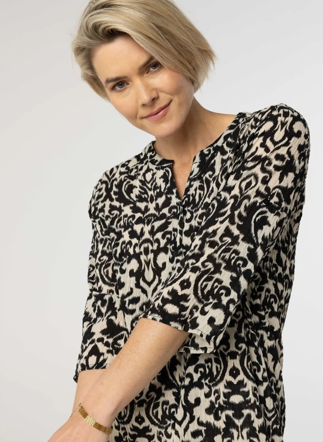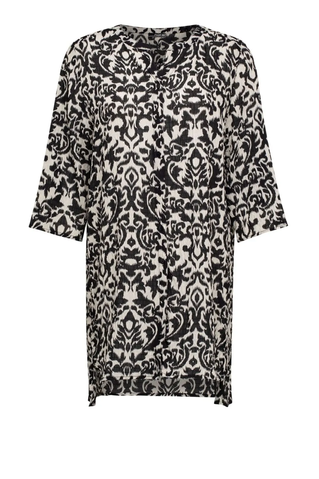 Dit Voile Tuniek Met V-Hals En Halflange Mouwen Heeft Een Grafische Print. De Tuniek Heeft Splits Aan De Zijkant. De Mouwen Kunnen Middels Een Knoop Opgestroopt Worden. In Dezelfde Print Hebben We Een Enkellange Jurk.